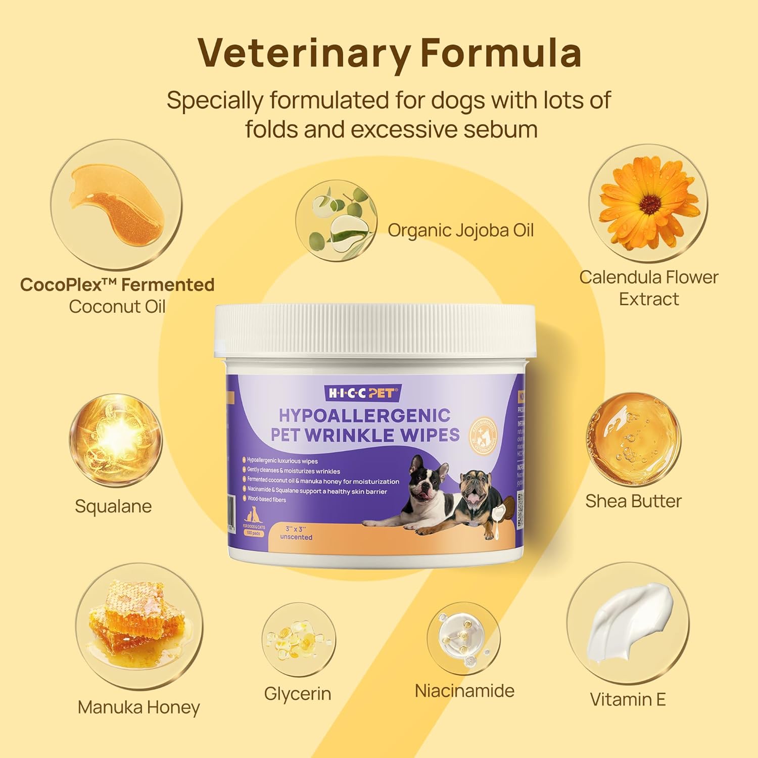 Targets Hidden Dirt & Infection Risks - Specially designed for wrinkled breeds, our extra-thick textured puppy wipes reach deep into stubborn facial folds, tail pockets, and skin creases—where up to 73% of skin infections begin. They gently lift away trapped dirt, odor, and buildup while soothing redness, itching, and irritation. With regular use, you help prevent painful infections and keep your dog’s skin fresh, clean, and healthy Powered by Natural Healing Ingredients - Made with a blend of CocoPlex Fermented Coconut Oil and Manuka Honey for their natural cleansing and anti-inflammatory power, plus Organic Jojoba Oil to balance oils and Shea Butter to deeply hydrate. Every wipe nourishes and protects sensitive skin, helping your pet stay comfortable, soothed, and free from irritation—naturally Hypoallergenic, Gentle & Non-Irritating - French Bulldogs and other wrinkle-faced breeds have extra-sensitive skin prone to irritation and infection. That’s why our pet wipes are crafted with Lyocell Fiber—ultra-soft, naturally smooth, and far gentler than ordinary fabrics. They glide effortlessly over delicate folds, deep-clean without abrasion Multi-Purpose for Complete Dog Care - More than just wrinkle care—our pet wipes for dogs effortlessly remove tear stains, odor, and stubborn grime from facial folds, paws, tail pockets, bottoms, and beyond. Wherever dirt or discomfort hides, these gentle wipes deliver instant freshness without residue or strong smells. Safe for daily use, they leave only soft, clean, kissable skin your pup will love Veterinarian-Approved Pet Wellness - Recommended by veterinary professionals, our dog face wipes are crafted with premium ingredients for safe, effective daily use. Each batch undergoes rigorous quality testing to ensure safety, purity, and performance you can trust. Loved by pet parents and backed by expert care, it’s a gentle, dependable solution to keep your furry friend healthy and happy › See more product details