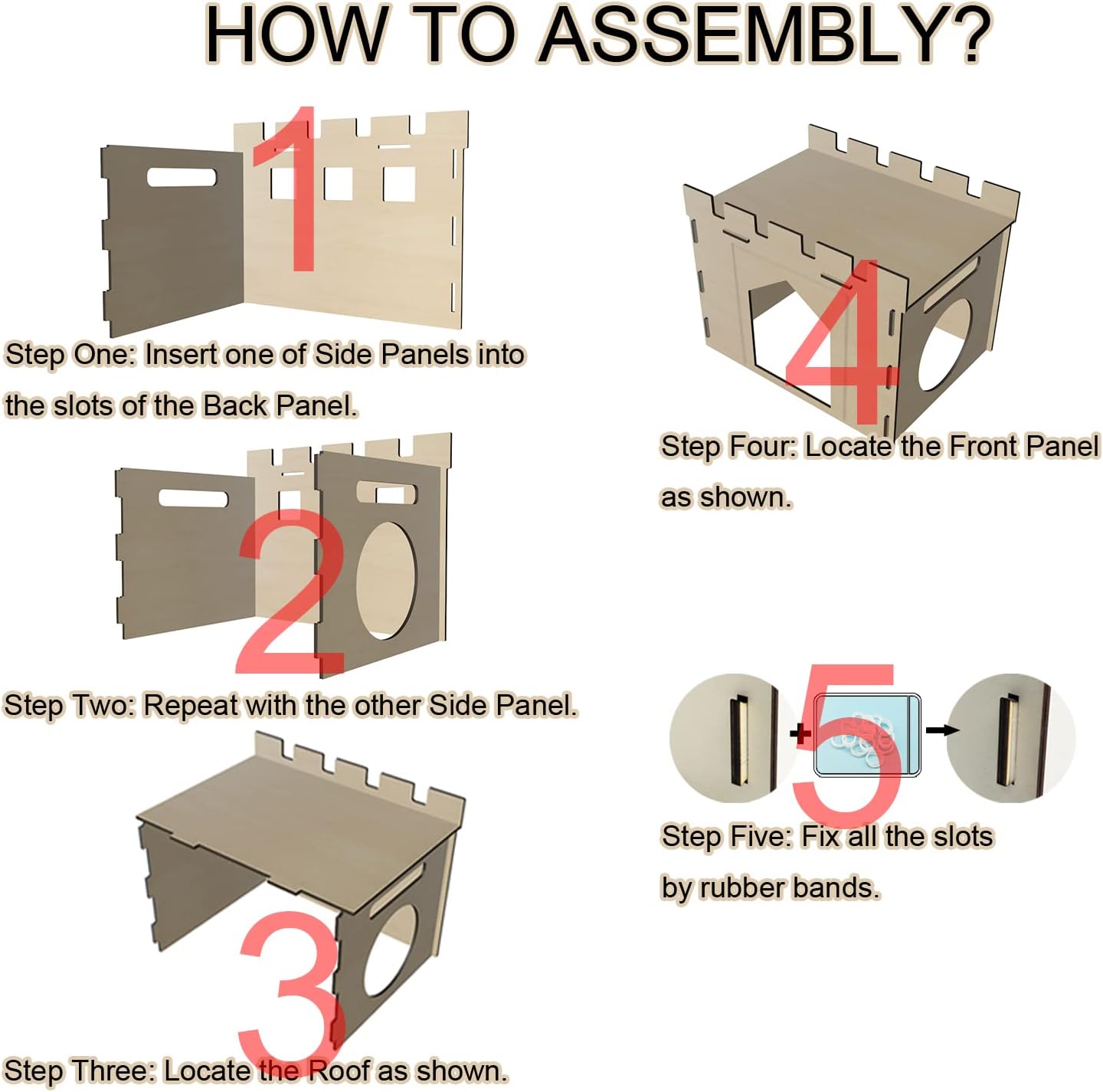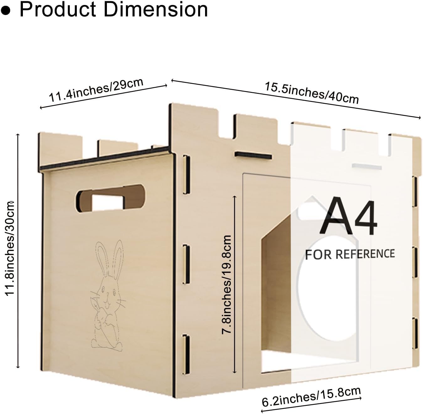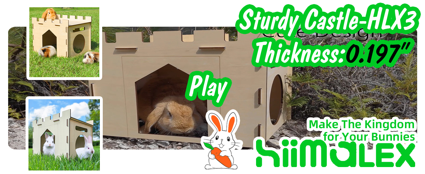 About this item 【Large Space】: Give your furry friend the gift of comfort and security with the HIIMALEX Large Wooden Rabbit Hideout! After installation, the dimension is Castle:15.5”(L)x11.4” (W)x11.8”(H), Enterance:6.2” (W)x7.8(H)”, The hidey house for rabbits is spacious for large bunnies, cats, adult guinea pigs, hamsters, chinchilla, ferrets and various small animals to play, hide, rest and sleep in it 【Easy Use and Portablilty】: This rabbit hiding house only requires 5 panels to put together. The wood castle can be disassembled and stored flat to save storage space. The convenient side panel handles make it easy to transport the bunny house, providing a portable solution that's perfect for travel or storage 【Adorable Design】: The adorable design of this wooden rabbit hideout is sure to capture your pet's attention with its cute and charming appearance. Not only is it a perfect playhouse for your furry friends, but it also serves as a beautiful decoration that will enhance the overall aesthetic of your home 【SAFETY】: Safety is our top priority. It is the Only Rabbit House with Reinforced Dual Security. Stretch-resistant rubber bands for easy setup OR heavy-duty zip ties for aggressive chewers (no tools needed). The wooden board is thickened to 5mm, making the whole wooden bunny hideaway stronger to support rabbit weight more than cardboard house. Made from solid slow-growth timber, this hiding hideout is safe for both animals and humans to touch Every product from HIIMALEX is designed and manufactured under the highest standards of quality in the industry. We ensure that every box of the HIIMALEX enclosure is carefully inspected before it heads to your doorstep. And as we stand by the quality of our porduct, please know that you can reach out to us if ever you have concerns with your purchase › See more product details
