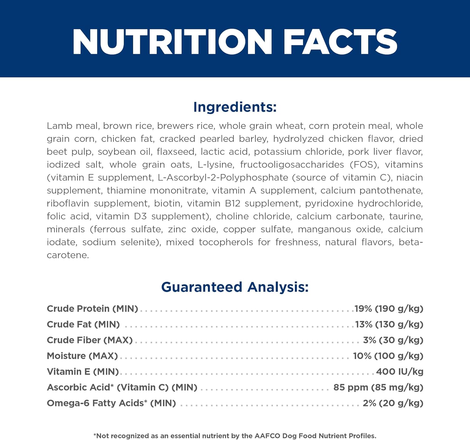 Product Description For grown dogs that like variety in their daily meal, Hill's Science Diet Adult dry dog food provides high quality, easy-to-digest ingredients that fuel the energy needs of your adult dog in a delicious lamb flavor. Packed with omega-6s & vitamin E to give your canine a healthy skin & coat, this premium dog food made with natural ingredients also provides high-quality protein to help your full grown dog maintain muscle. Since adult dogs need a strong gut, this grown dog food uses natural fibers to promote healthy digestion. This adult dog food is specially formulated with decades of cutting-edge research to be a great-tasting meal your adult dog can truly enjoy. There’s more to love with the new look of Science Diet. Some of our products also have new names, new kibble shapes & new formulas. From the Manufacturer Hill’s Pet Nutrition’s Mission: To help enrich and lengthen the special relationships between people and their pets. More than 220 veterinarians, food scientists, technicians and Ph.D. nutritionists at Hill's develop all of Hill's pet foods to meet the needs of your pets. Hill’s only accepts ingredients from suppliers whose facilities meet stringent quality standards and who are approved by Hill's. Not only is each ingredient examined to ensure its safety, we also analyze each product's ingredient profile for essential nutrients to ensure your pet gets the stringent, precise formulation they need. Hill’s uses only high-quality ingredients including real chicken, lamb or salmon protein. Hill’s dry pet foods have quality protein as the first ingredient and provide clinically proven antioxidant benefits. Plus, they’re made with natural ingredients (plus vitamins, minerals & amino acids) and never contain artificial colors, flavors, preservatives or chicken by-product meal. Hill’s Food, Shelter & Love program donates food to shelters across the country, providing the proper nutrition that helps pets find their way to loving homes. With every purchase of Science Diet you help feed over 100,000 homeless pets every day, 365 days a year.