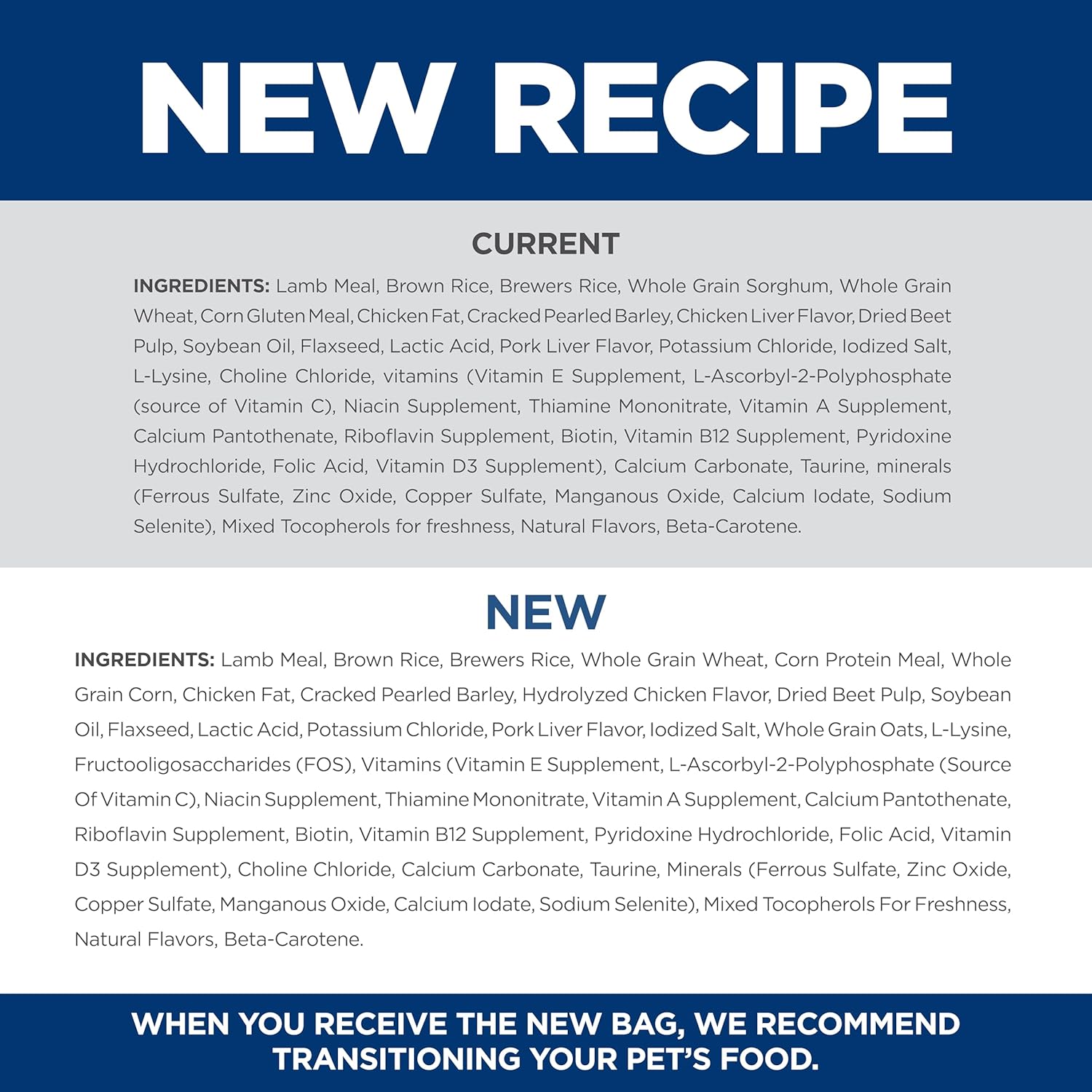 - Directions: Please see package for complete feeding instructions. Adjust feeding amounts as necessary to maintain optimal weight. If you are unsure, ask your veterinarian. New to this food? Mix increasing amounts of your pet's new food with decreasing amounts of the old food over a 7 day period. Keep fresh water available at all times! Your pet's nutritional needs may change as they age. Ask your vet at every checkup.