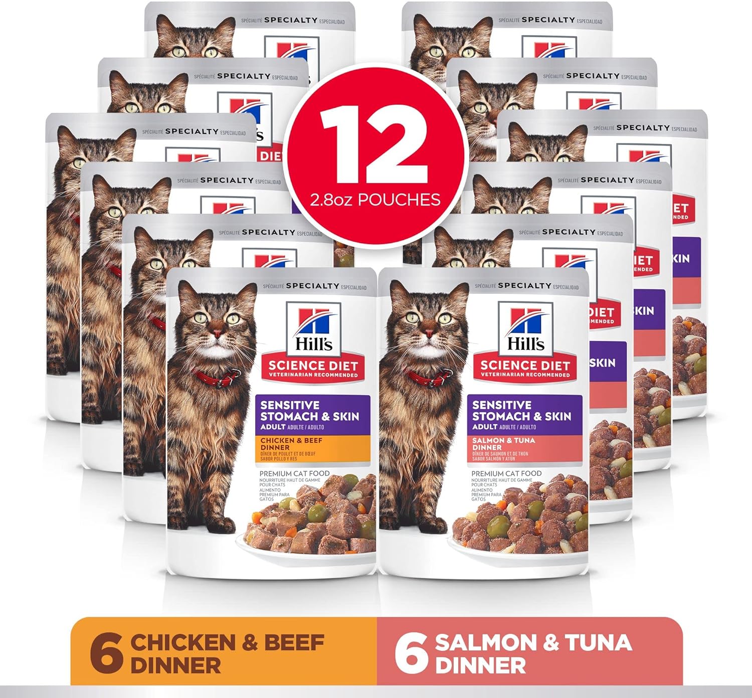 Hill's Science Diet Adult Sensitive Stomach & Skin cat food is science-backed nutrition that is specially formulated to nourish healthy pets who are prone to occasional digestive upsets and support healthy skin. This highly digestible formula for sensitive stomachs uses prebiotic fiber to fuel gut bacteria and support a balanced microbiome. In addition, this cat food is made with natural ingredients with added vitamins, minerals and amino acids. This food is an excellent source of vitamin E and Omega-6 fatty acids, nourishing the cat's skin and helping to maintain a healthy, shiny fur. This food is packed with a powerful combination of clinically proven antioxidants, including vitamins C and E, to support a healthy immune system. This nutrition is formulated with decades of cutting-edge research to be a great-tasting meal for adult cats.