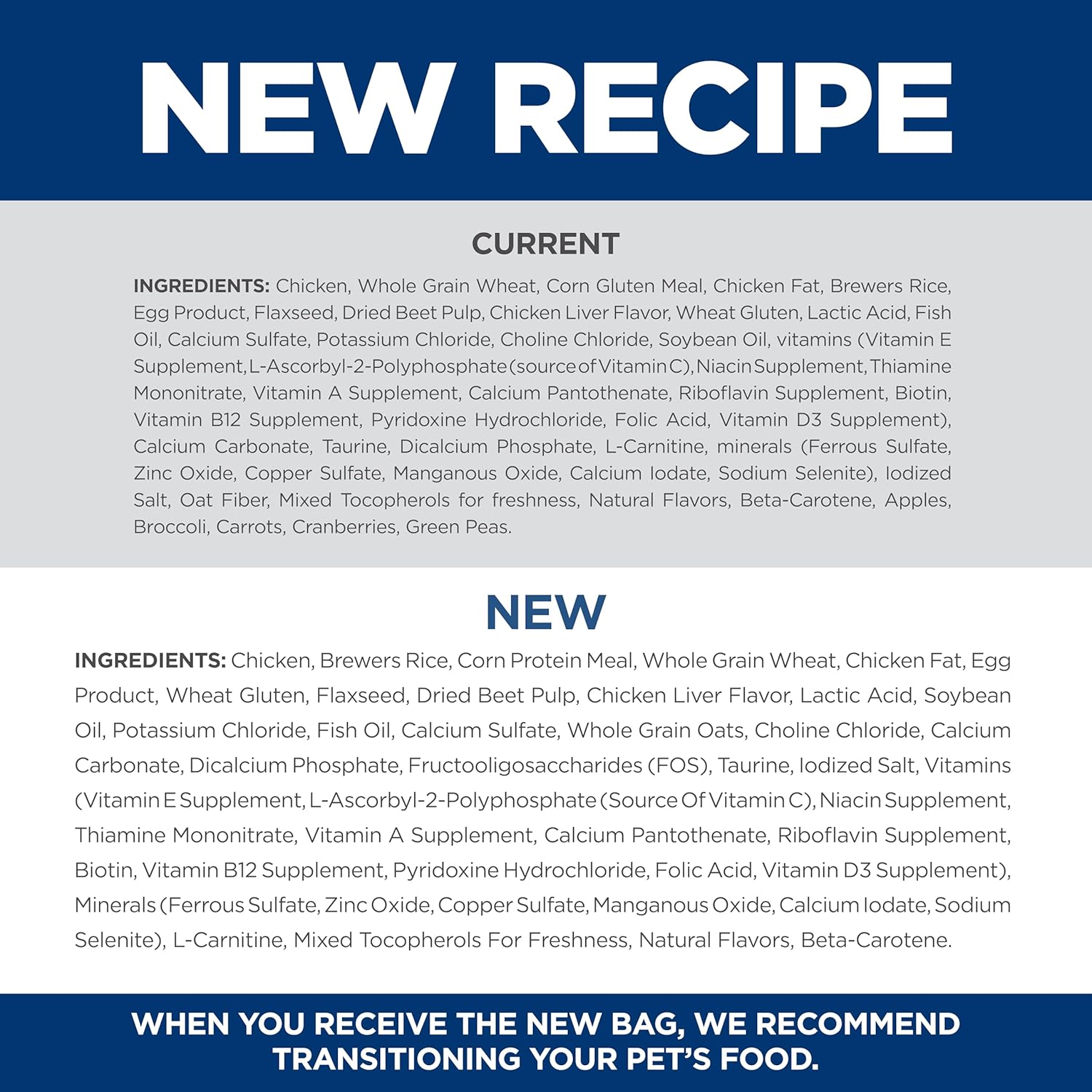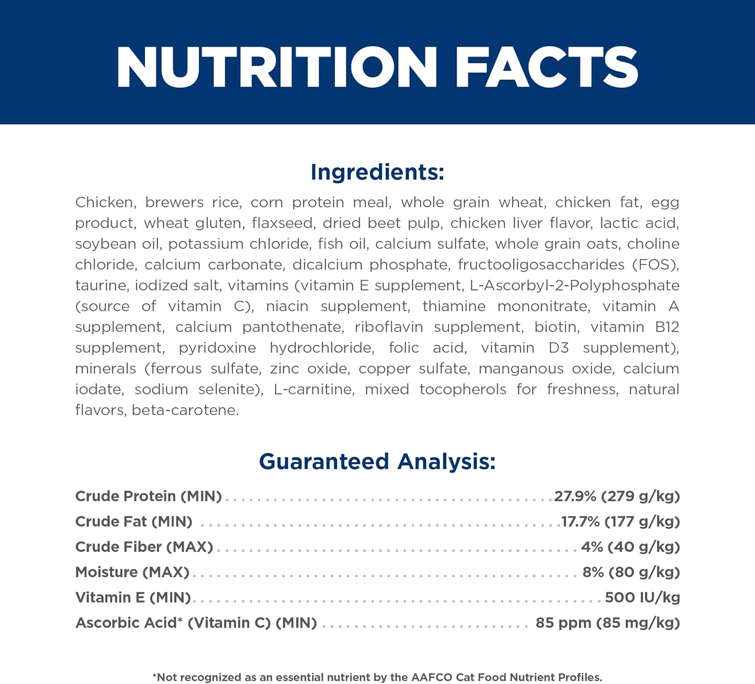 Product Description Your cat may be getting older, the need for love and interaction doesn't change. That's why Hill's Science Diet Adult 11+ dry cat food supports healthy aging during the golden years. This mature cat food made with natural ingredients contains a special blend to help keep older cats agile and more alert, along with vitamin E, omega-3s and omega-6s to support healthy skin and fur. Natural fibers and easy-to-digest ingredients are used to help cats with sensitive stomachs, and balanced minerals promote bladder and kidney health in your older cat. This premium cat food also is a great source of taurine – an essential component for feline heart health. There’s more to love with the new look of Science Diet. Some of our products also have new names, new kibble shapes & new formulas. From the Manufacturer Hill’s Pet Nutrition’s Mission: To help enrich and lengthen the special relationships between people and their pets. More than 220 veterinarians, food scientists, technicians and Ph.D. nutritionists at Hill's develop all of Hill's pet foods to meet the needs of your pets. Hill’s only accepts ingredients from suppliers whose facilities meet stringent quality standards and who are approved by Hill's. Not only is each ingredient examined to ensure its safety, we also analyze each product's ingredient profile for essential nutrients to ensure your pet gets the stringent, precise formulation they need. Hill’s uses only high-quality ingredients including real chicken, lamb or salmon protein. Hill’s dry pet foods have quality protein as the first ingredient and provide clinically proven antioxidant benefits. Plus, they’re made with natural ingredients (plus vitamins, minerals & amino acids) and never contain artificial colors, flavors, preservatives or chicken by-product meal. Hill’s Food, Shelter & Love program donates food to shelters across the country, providing the proper nutrition that helps pets find their way to loving homes. With every purchase of Science Diet you help feed over 100,000 homeless pets every day, 365 days a year.