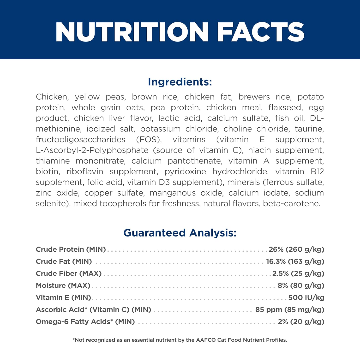 Just because your cat is getting older, it doesn't mean they're out of the game. Hill's Science Diet Adult 7+ No Corn, Wheat, Soy dry cat food supports graceful aging in cats, providing a synergistic ingredient blend that supports the energy & activity level in older felines. This mature cat food made with high quality ingredients provides cats 7 years and older with taurine: an essential component for heart health. Balanced minerals promote bladder and kidney health, while vitamin E, omega-3 and omega-6 fatty acids support healthy skin and fur. Easy-to-digest ingredients help aging cats get the nutrition they need.