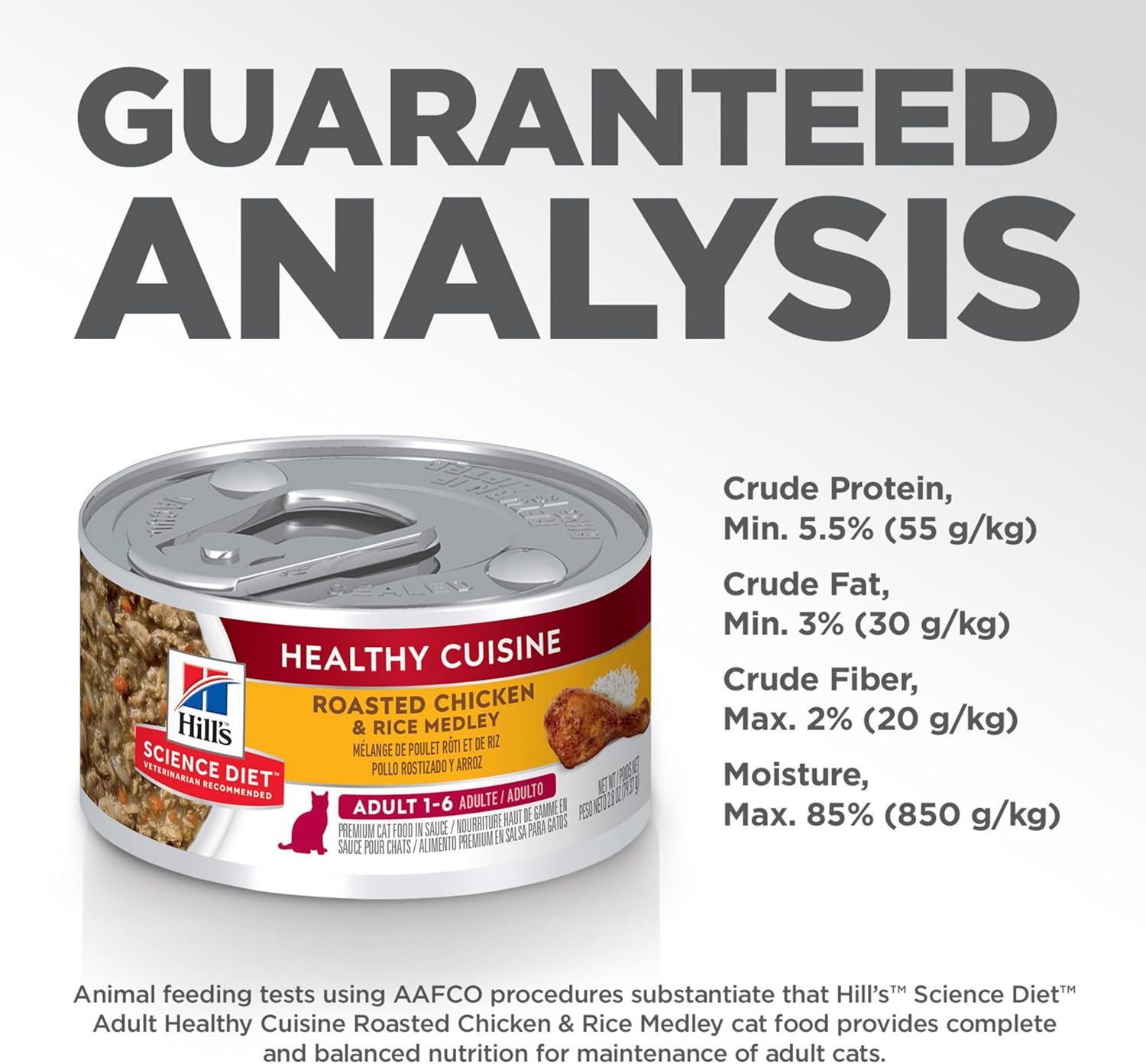 With rich, high-quality protein and clinically proven antioxidants, Hill's Science Diet Adult Healthy Cuisine Roasted Chicken & Rice Medley combines the delicious flavors of real chicken and rice in a mouthwatering sauce your adult cat will love. This easy-to-digest adult cat food made with natural ingredients helps your kitty maintain lean muscle while promoting a strong immune system.
