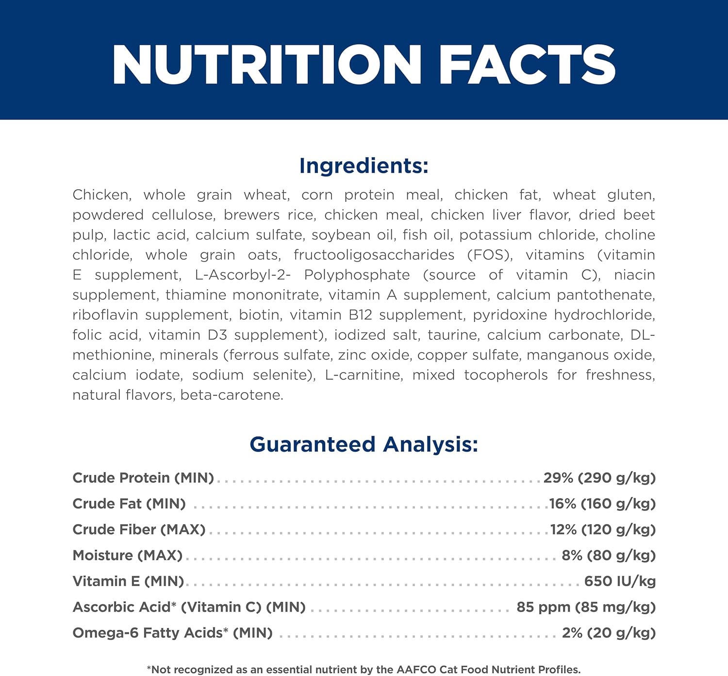 Product Description Your cat may be getting older, but the need for love and interaction doesn't change. Hill's Science Diet Indoor Adult 11+ dry cat food is specially formulated to fuel the energy needs of cats with an indoor lifestyle during their golden years. This mature cat food made from natural ingredients contains a special blend of prebiotic fibers and antioxidants, ActivBiome+ Multi-Benefit, to support digestion, immune system and organ health. The natural fibers and easy-to-digest ingredients support easier litter box clean up and optimal levels of nutrients for eyesight, heart health, kidney health and joint health. Lean muscles are supported with high-quality protein and healthy skin & fur with Omega-6 & Vitamin E. From the Manufacturer Hill’s Pet Nutrition’s Mission: To help enrich and lengthen the special relationships between people and their pets. More than 220 veterinarians, food scientists, technicians and Ph.D. nutritionists at Hill's develop all of Hill's pet foods to meet the needs of your pets. Hill’s only accepts ingredients from suppliers whose facilities meet stringent quality standards and who are approved by Hill's. Not only is each ingredient examined to ensure its safety, we also analyze each product's ingredient profile for essential nutrients to ensure your pet gets the stringent, precise formulation they need. Hill’s uses only high-quality ingredients including real chicken, lamb or salmon protein. Hill’s dry pet foods have quality protein as the first ingredient and provide clinically proven antioxidant benefits. Plus, they’re made with natural ingredients (plus vitamins, minerals & amino acids) and never contain artificial colors, flavors, preservatives or chicken by-product meal. Hill’s Food, Shelter & Love program donates food to shelters across the country, providing the proper nutrition that helps pets find their way to loving homes. With every purchase of Science Diet you help feed over 100,000 homeless pets every day, 365 days a year.