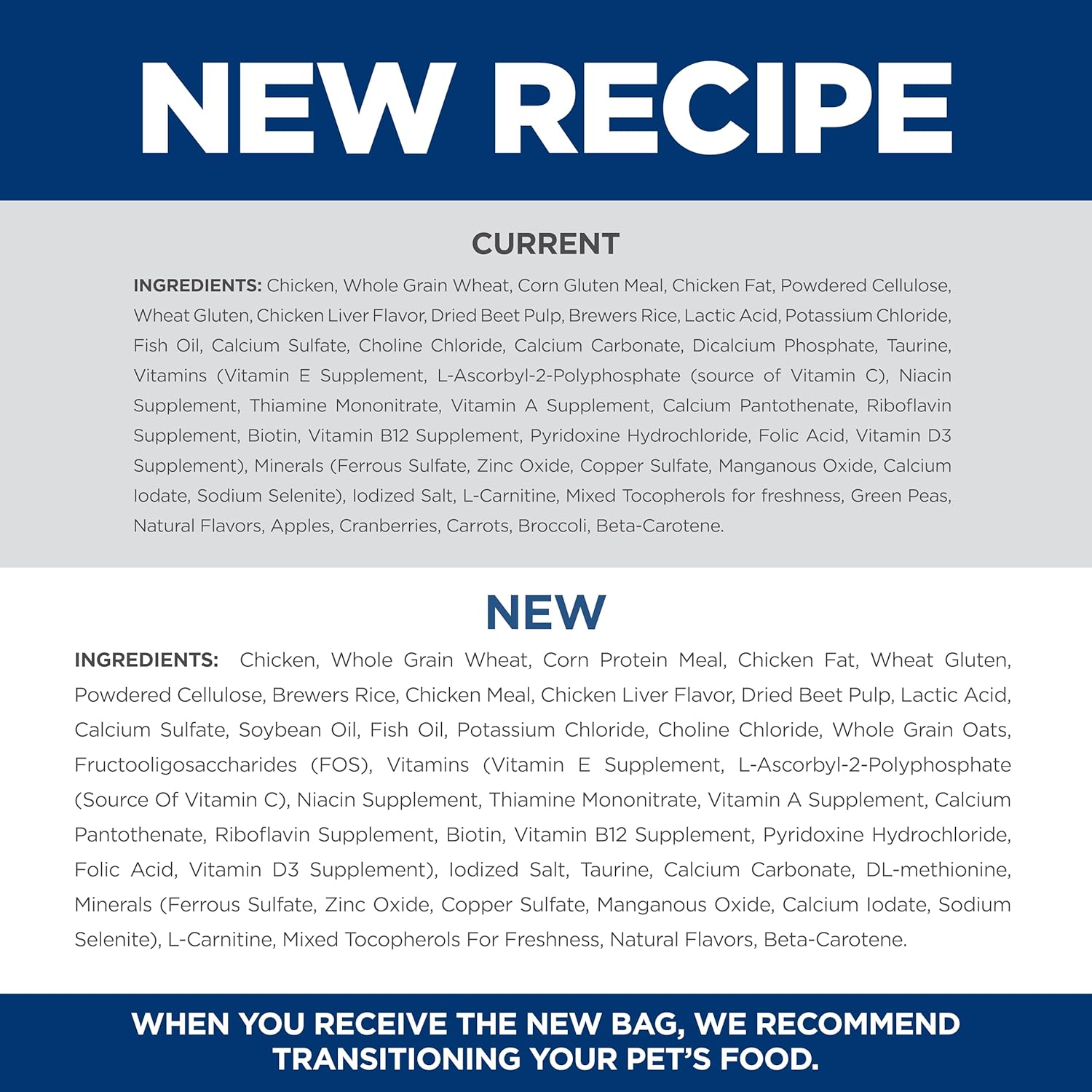 - Directions: Please see package for complete feeding instructions. Adjust feeding amounts as necessary to maintain optimal weight. If you are unsure, ask your veterinarian. New to this food? Mix increasing amounts of your pet's new food with decreasing amounts of the old food over a 7 day period. Keep fresh water available at all times! Your pet's nutritional needs may change as they age. Ask your vet at every checkup.
