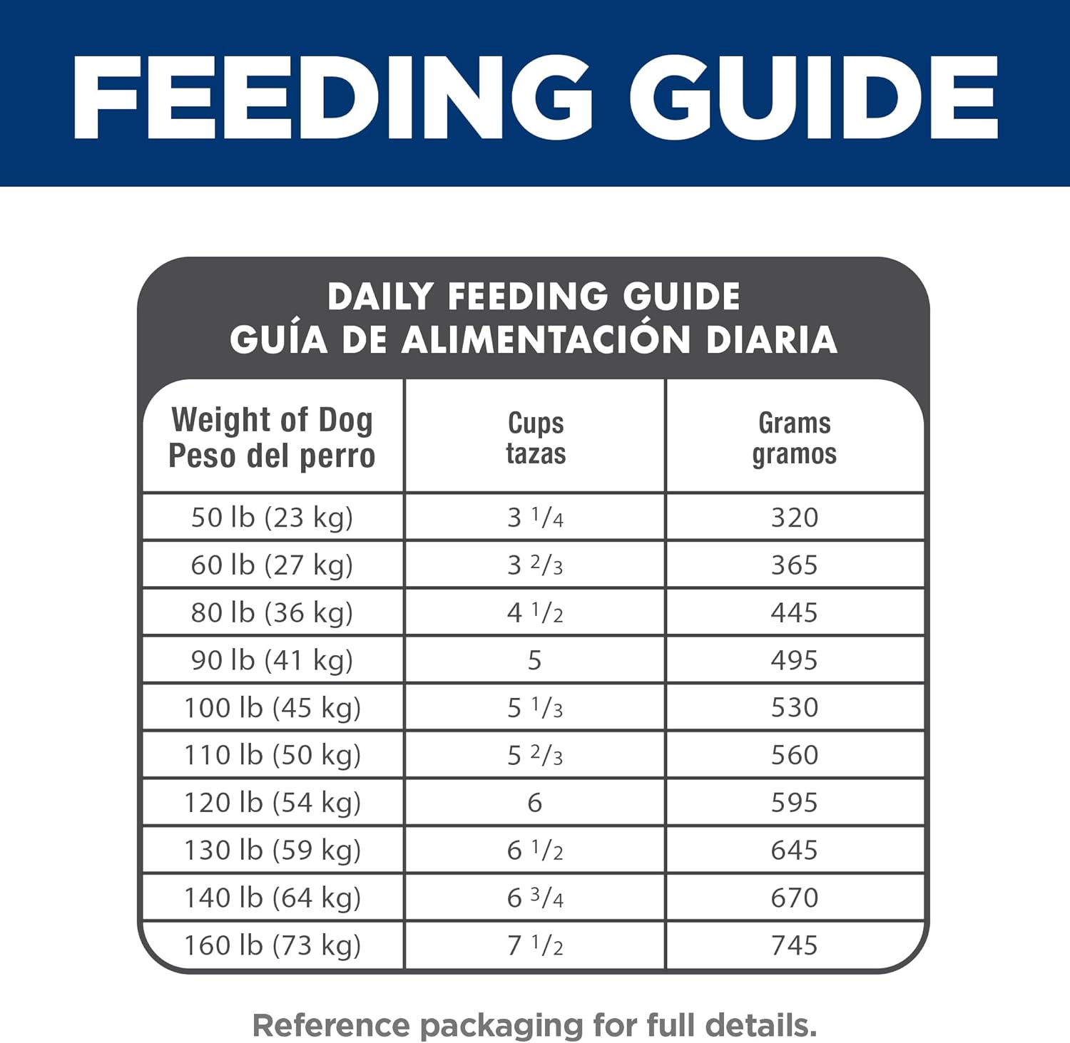 - Directions: Daily Feeding Guide (1 cup = 8 oz) Feed your dog 2-2/3 to 3-2/3 cups per 50 pounds of body weight per day; 3 to 4-1/4 cups per 60 pounds of body weight per day; 3-3/4 to 5-1/4 cups per 80 pounds of body weight per day; 4-1/2 to 6-1/4 cups per 100 pounds of body weight per day; 5 to 7 cups per 120 pounds of body weight per day; 5-3/4 to 8 cups per 140 pounds of body weight per day; 6-1/3 to 8-3/4 cups per 160 pounds of body weight per day. Adjust feeding amounts as necessary to maintain optimal weight. If you are unsure, ask your veterinarian. Keep fresh water available at all times. New to this food? Please transition your pet by mixing increasing amounts of the new food with the old over a seven-day period.