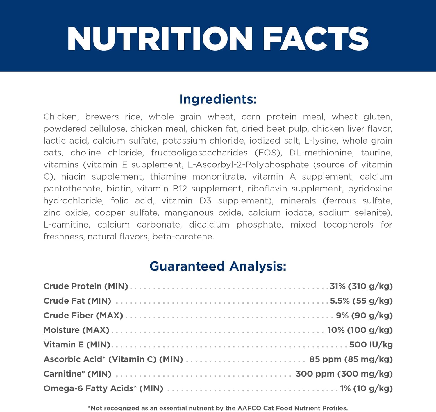 Whether your cat has a noticeable weight issue, or you would just like to keep your feline friend at a healthy weight. Hill's Science Diet Light Adult dry cat food is precise nutrition for less active adult cats requiring a low-calorie food. This cat food made with natural ingredients provides 20% fewer calories vs. Hill's Science Diet Adult, along with L-Carnitine to help support an ideal body weight in your grown cat. The quality protein and natural fibers help support your adult cat's hunger between meals, while vitamin E and omega-6 fatty acids promote shiny fur and nourish the skin. There’s more to love with the new look of Science Diet. Some of our products also have new names, new kibble shapes & new formulas.