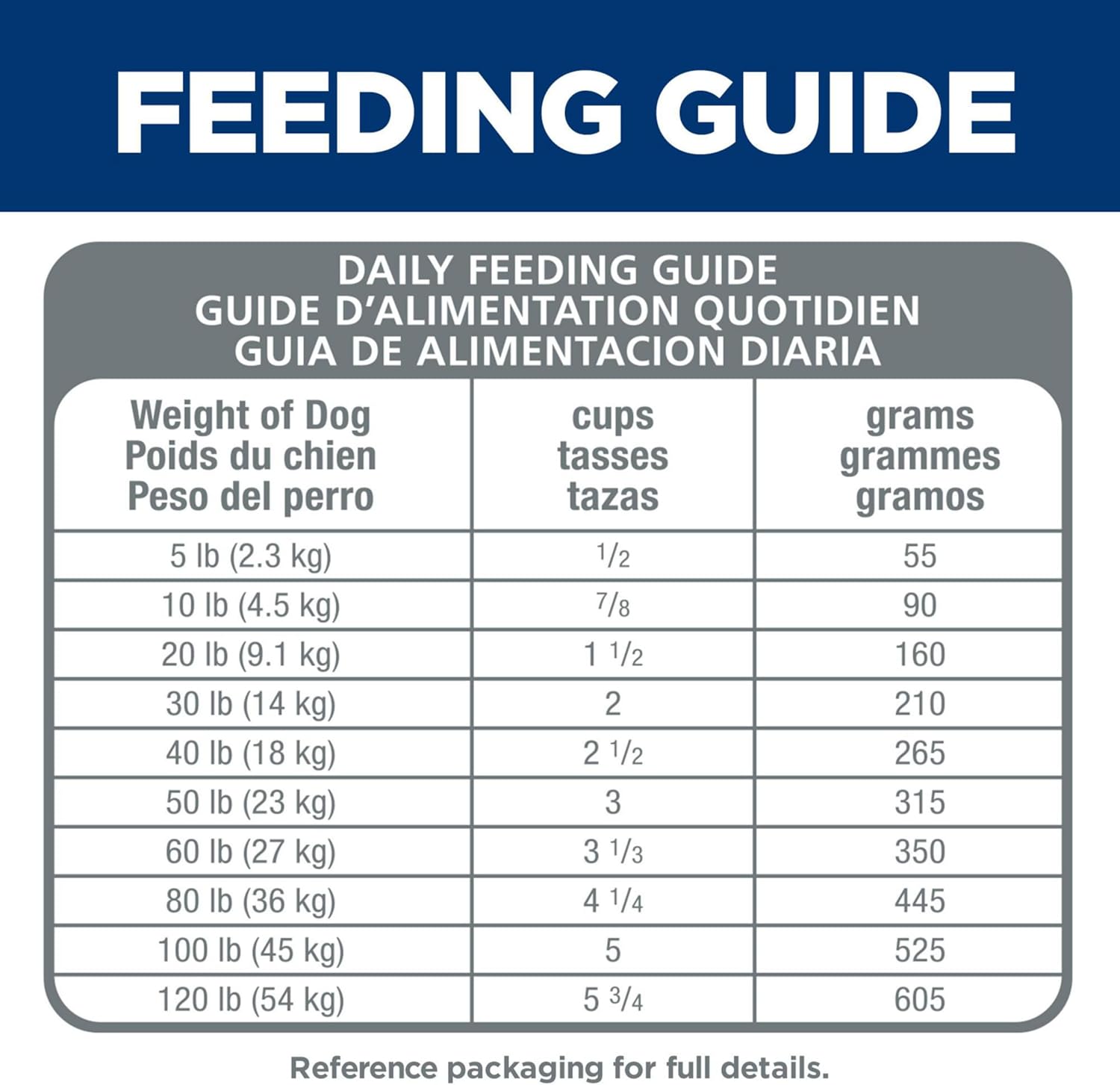 - Directions: Feed your dog 1/2 to 5/8 cup per 5 pounds of body weight per day; 3/4 to 1-1/8 cup per 10 pounds of body weight per day; 1-1/3 to 1-3/4 cup per 20 pounds of body weight per day; 2-1/4 to 3 cup per 40 pounds of body weight per day; 3 to 4-1/4 cup per 60 pounds of body weight per day; 3-3/4 to 5-1/4 cup per 80 pounds of body weight per day; 4-1/2 to 6 cup per 100 pounds of body weight per day