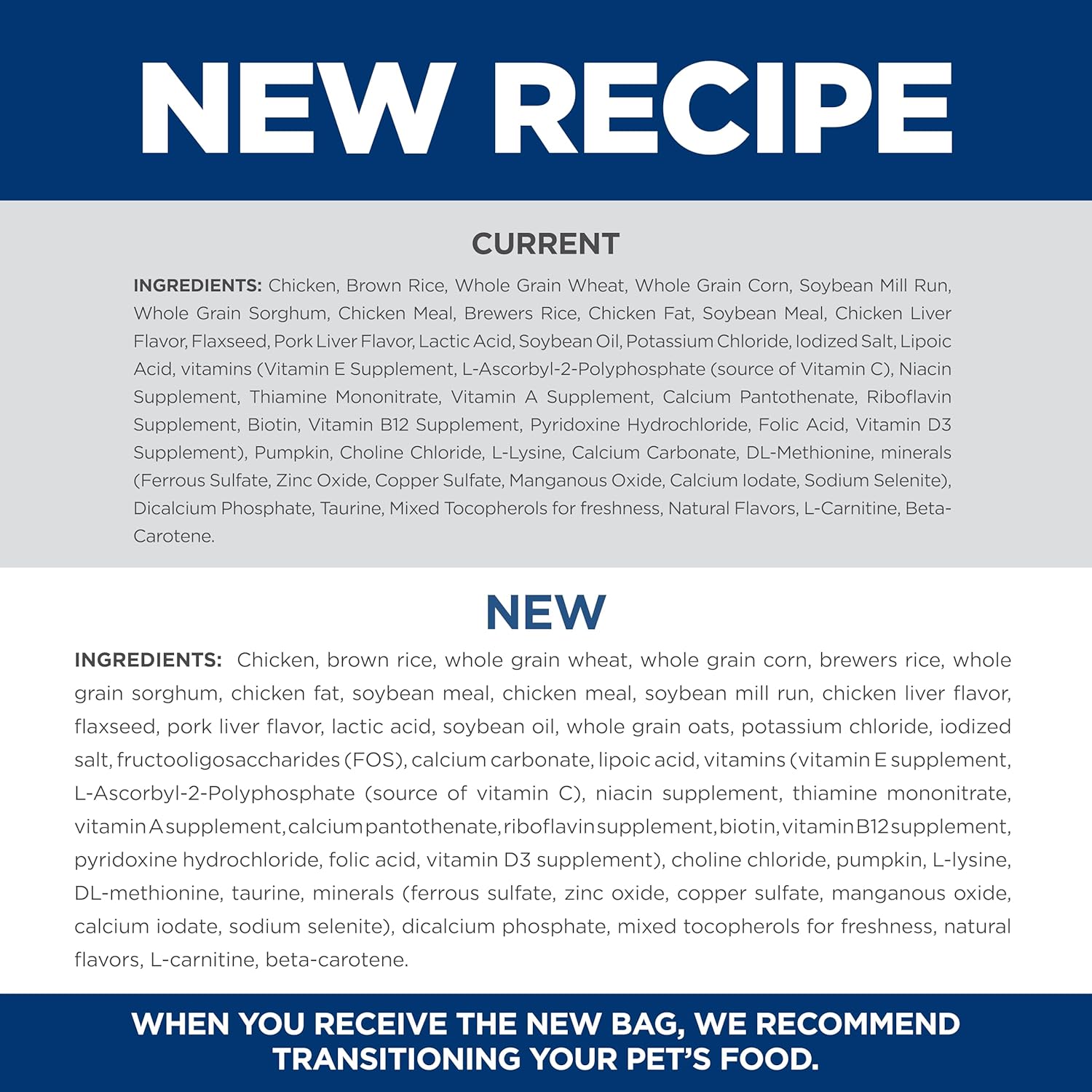 - Directions: Please see package for complete feeding instructions. Adjust feeding amounts as necessary to maintain optimal weight. If you are unsure, ask your veterinarian. New to this food? Mix increasing amounts of your pet's new food with decreasing amounts of the old food over a 7 day period. Keep fresh water available at all times! Your pet's nutritional needs may change as they age. Ask your vet at every checkup.