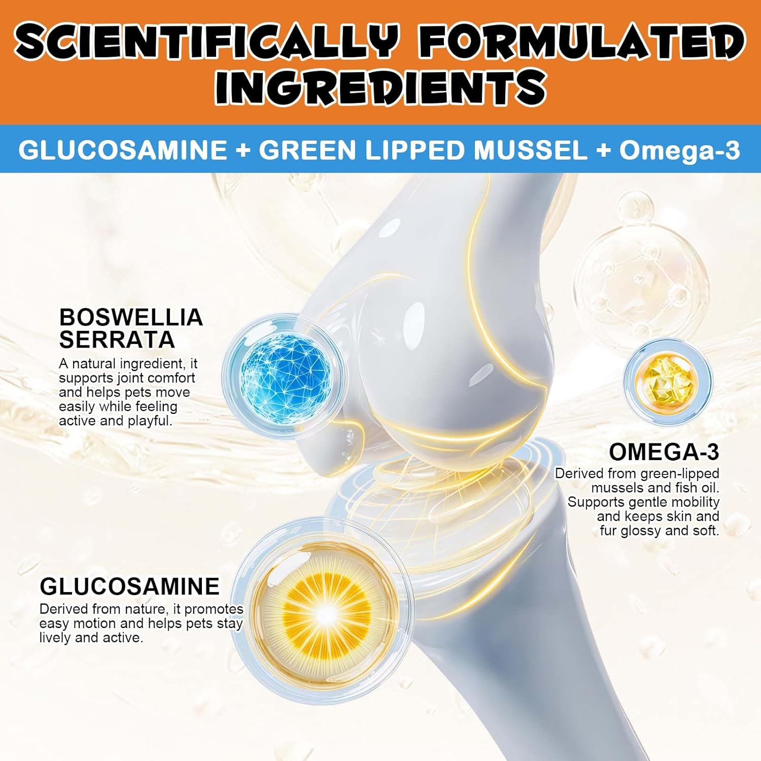 • THE INSIDE SCOOP Formulated with powerful, natural ingredients like glucosamine, chondroitin, omega-3s, and green-lipped mussel, these chews help maintain healthy cartilage and joint fluid while easing occasional stiffness from daily activities. Our joint supplements also include antioxidants that joint wellness from the inside out—for smoother motion and longer-lasting comfort.