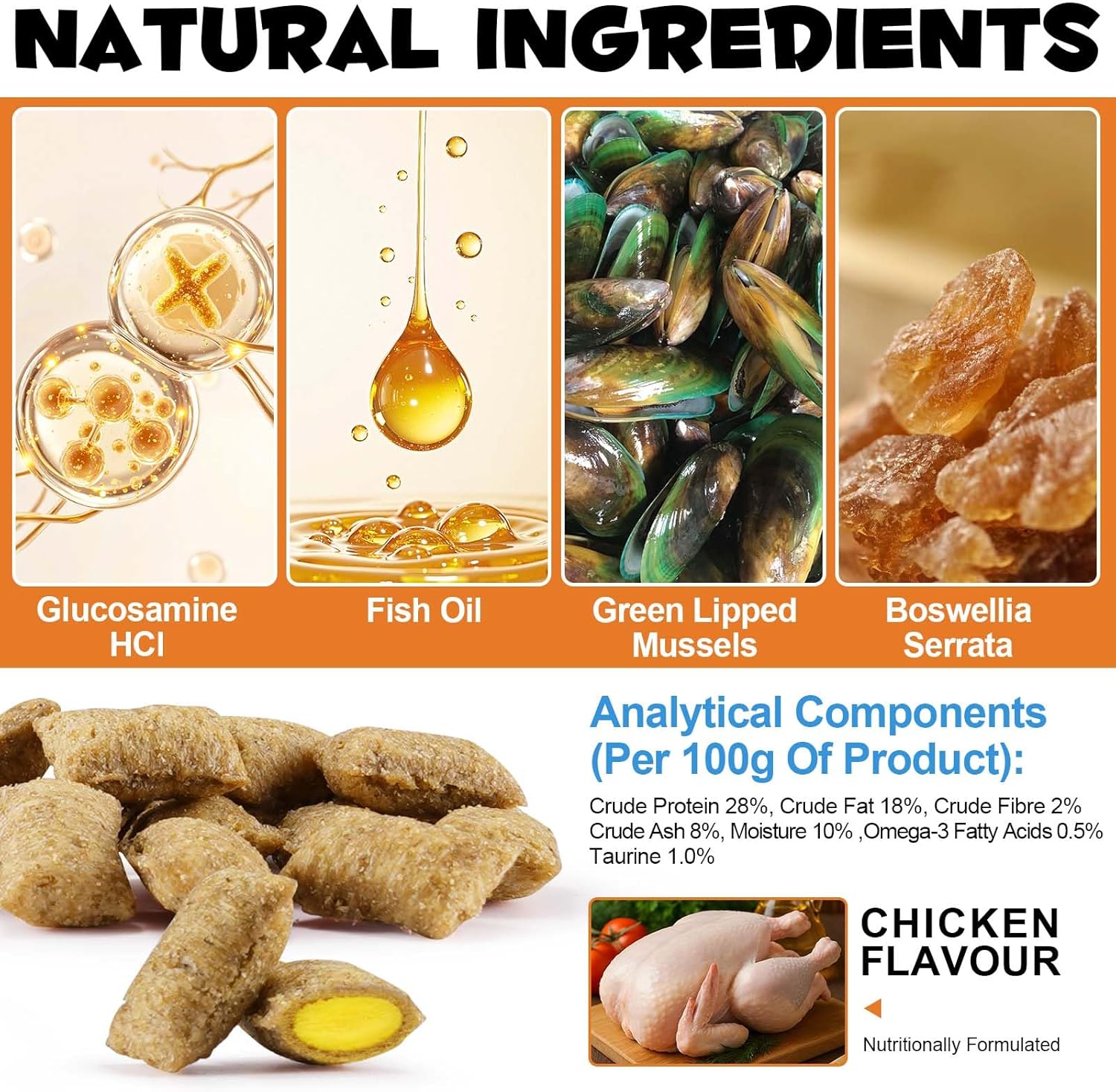 • NATURAL LNGREDIENTS CHICKEN FLAVOR Crunchy Outside & Soft Inside with a savory chicken flavor, these bites are highly palatable.In its natural form, joint supplement for cats are more easily absorbed and helps alleviate joint stiffness and discomfort, promoting smoother movement.
