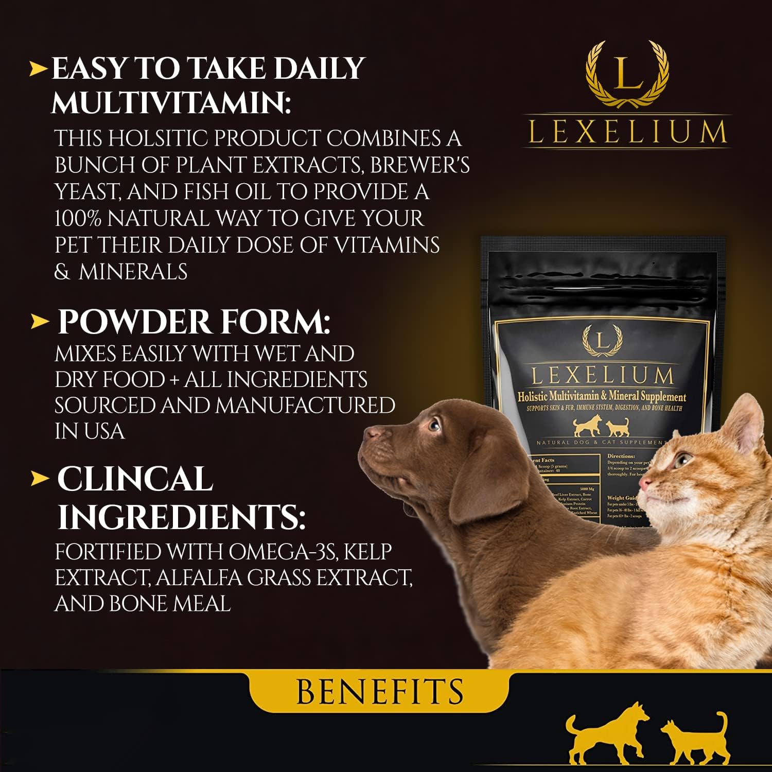 About this item DAILY 12-IN-1 SUPPLEMENT - This multivitamin is packed full of different nutrients designed to comprehensively provide nutrients that could be missing from your pet's diet and supporting skin, coat, joints, heart, digestive function, and immune response for pets of all ages, breeds, and sizes. HOLISTIC MULTIVITAMIN W/ FISH OIL - The majority of nutritional sources in this product are derived from plant extracts and fish oil to provide a natural and organic way of providing nutrients, increasing their effectiveness and bio-availability COMPREHENSIVE VETERINARIAN FORMULATED POWDER SUPPLEMENT - Provides an excellent source of vitamins A,B,C, E, and K. Also provides trace minerals such as manganese, zinc, iron, magnesium, calcium, potassium, as well as antioxidant/anti-inflammatory compounds such as saponins, flavonoids, phytosterols, phytoestrogens, and alkaloids HIGH QUALITY CLINICAL INGREDIENTS GUARANTEED- All ingredients used in this product are sourced locally and sustainably, and painstakingly tested for quality and purity MULTI-PET CONVENIENT & EASY TO MIX - Just as effective for dogs as it is for cats, this product mixes easily to your pet's wet food and is neutral enough that they'll barely notice it βΊ See more product details