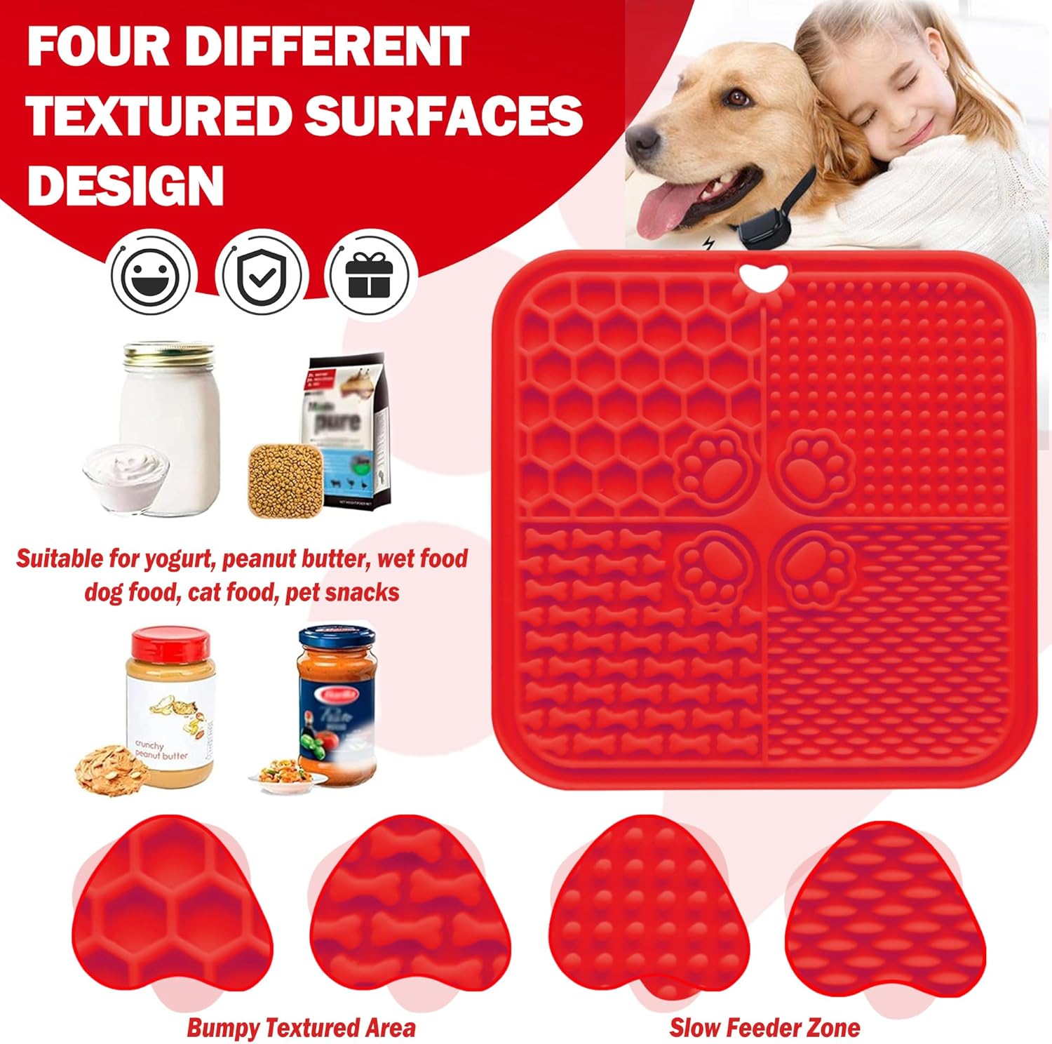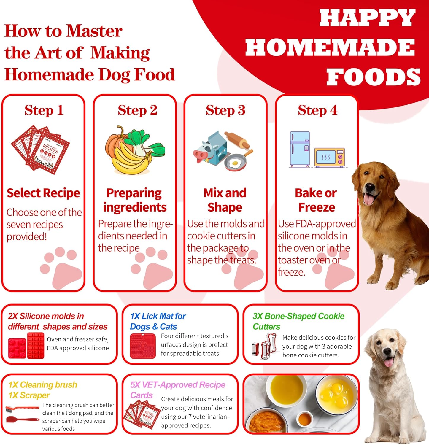 About this item PACKS:Our make dog treat making kit includes 1 lick mat for dogs & cats, 2 silicone dog treat mold, 3 dog cookie cutter,1 cleaning brush ,1 scrape and 4 cards(7 healthy recipes,1 kitchen conversion chart card,1 human foods for dogs). SLOW FEEDER MAT FOR DOGS & CATS: Four different textured surfaces design is prefect for spreadable treats, such as cream cheese, yoghurt, peanut butter and so on. It is a peanut butter slow feeder mat for dogs to extend the feeding time and aid digestion. This lick mat is an ideal size for cats, puppies, small meduim and large dogs. QUALITY MATERIALS:The silicone dog treat mold made of premium food grade silicone and dog bone cookie cutter is well constructed by stainless steel,very durable and tough, safe for your pets. VET APPROVED RECIPES:Each dog food recipe uses simple, all-natural ingredients that you can feel good about giving to your dog. You can make peanut butter apple, oatmeal banana peanut butter, or sweet potato dog treats with dog treat molds for baking and freezing. PEACE OF MIND:Make your own delicious dog treats with natural ingredients from your own kitchen, with recipes that are super easy, tasty and quick to make. Use ingredients you probably already have at home. You'll know exactly what's in each treat (for puppies with food allergies) VERSATILE:Use the dog cookie cutters for treats from the dog treat baking kit to make different shapes, not only can be used for making ice but also chocolates, candys, mousse, jelly, etc. Perfect for a dog's birthday, Christmas, or any time you want to make a special snack for the furry friend in your life. MAKE YOUR OWN DOG TREATS KIT:You can get a set of dog molds for frozen treats with recipes, no matter your family's puppies and kittens, surely will be very much like it!Trust us, this silicone molds for dog treats is the best choice for all dog owners! › See more product details