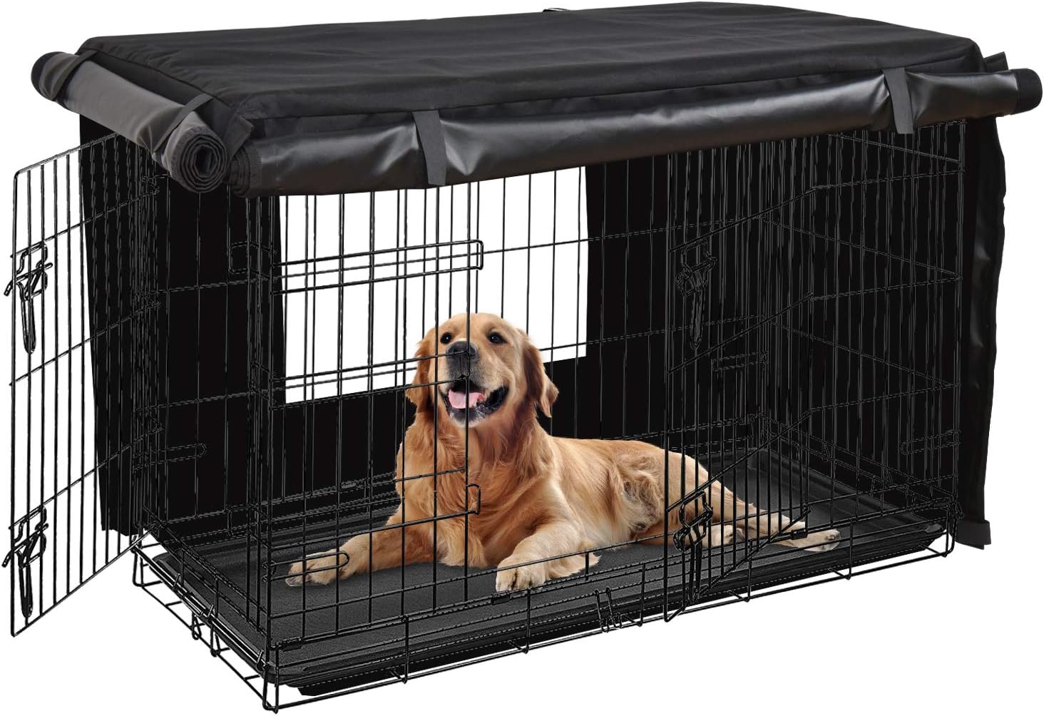 About this item Polyester 【Measures】This dog crate cover measures:37’’L x 24’’W x 25’’H, perfect fits 36-inch Wire crate, PLEASE MEASURE YOUR CRATE BEFORE ORDER. 【Heavy-Duty & Durable Material】This dog kennel cover is made of 600D Oxford fabric which is wind-proof, water-proof and more durable ,effectively prevent scratching. 【Durable Door & Mesh Window】this dog create cover is unique designed to fully open two side covers that won’t blocking the door at all. With the mesh window on the back gives your dog a well ventilated environment. 【Easy to use】Two covered pockets to storage pet toys and dog food. Four pasted toggles on the bottom help to fix the cover. 【Warranty】Quality and service is our first purpose. If the dog crate cover has any quality problems, please contact us at any time. › See more product details