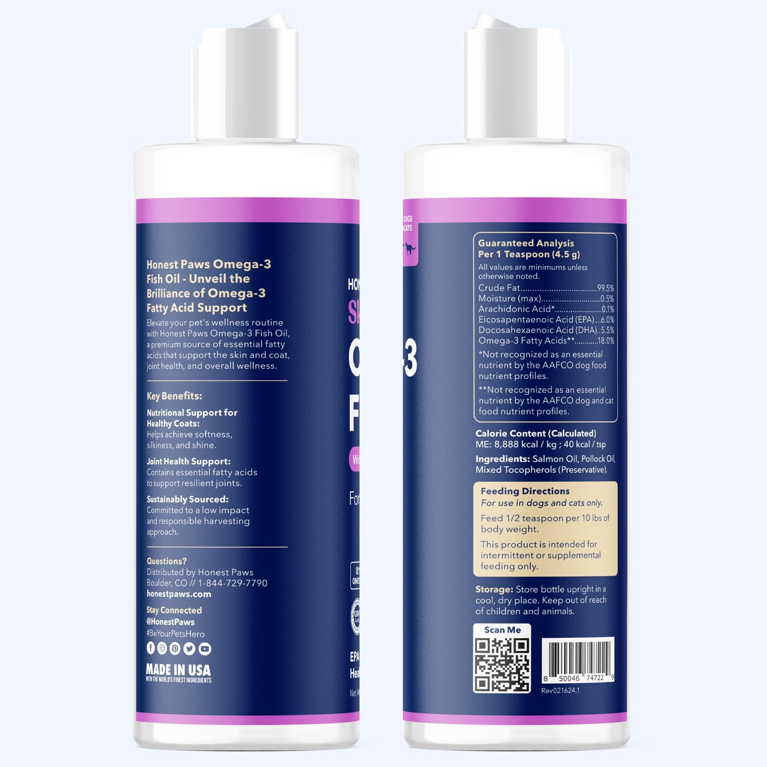 About this item Elevate Your Pet's Wellness Routine - Honest Paws Omega-3 Fish Oil, a premium source of essential fatty acids that support the skin and coat, joint health, and overall wellness. Nutritional Support for Healthy Coats - Helps achieve softness, silkiness, and shine. Premium Wild Caught and Sustainably Sourced Alaskan Salmon Oil provides essential fatty acids for a healthy coat and skin. Joint Health Support - Contains essential Omega-3 Fatty Acids to support resilient joints, skin and coat, joint health, and overall wellness. Sustainably Sourced - Committed to a low impact and responsible harvesting approach. Made in the USA - Made in the USA with Globally sourced ingredients. › See more product details