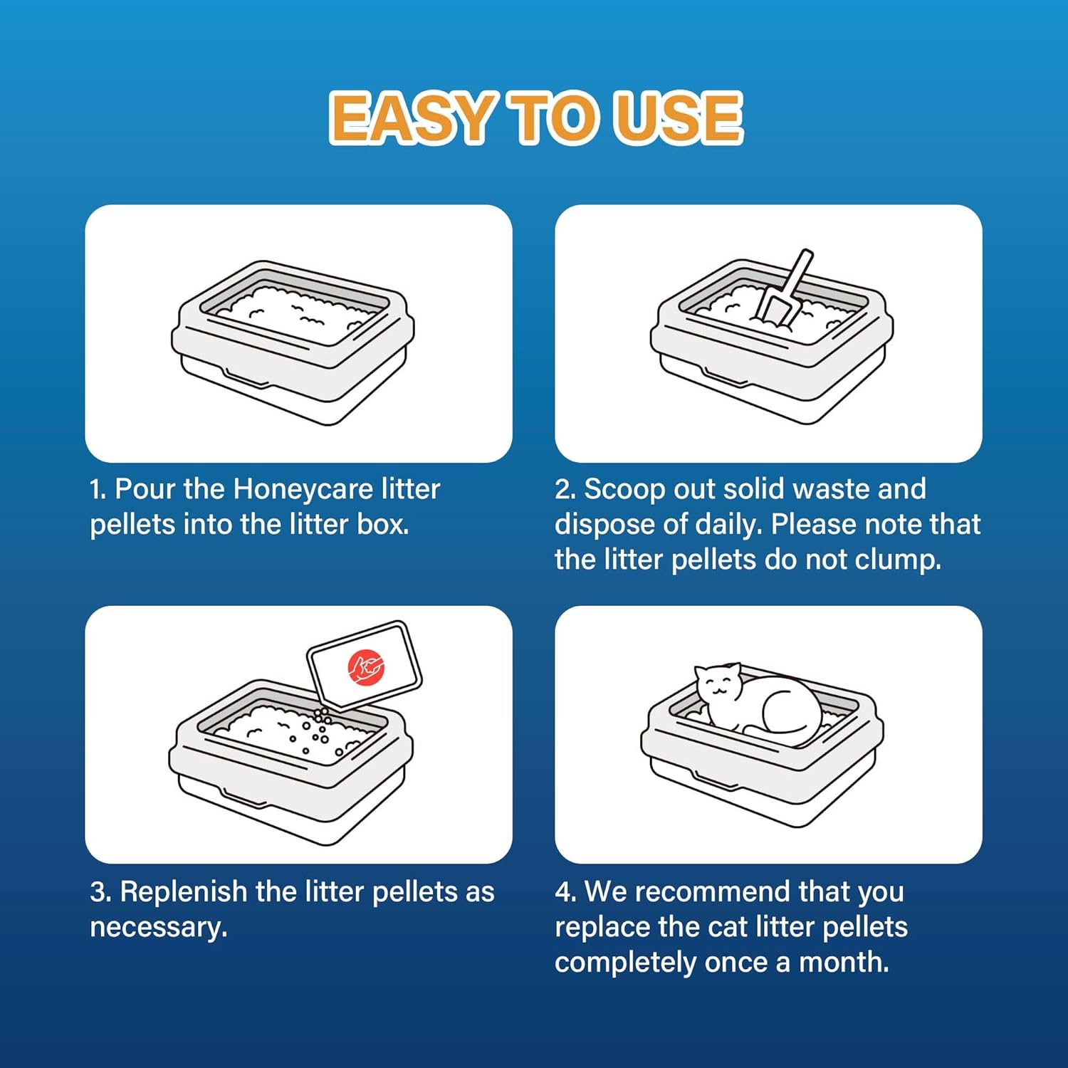 - Directions: Pour the Honeycare litter pellets into the litter box; Scoop out solid waste and dispose of daily; replenish the litter pellets as necessary; we recommend that you replace the cat litter pellets completely once a month.