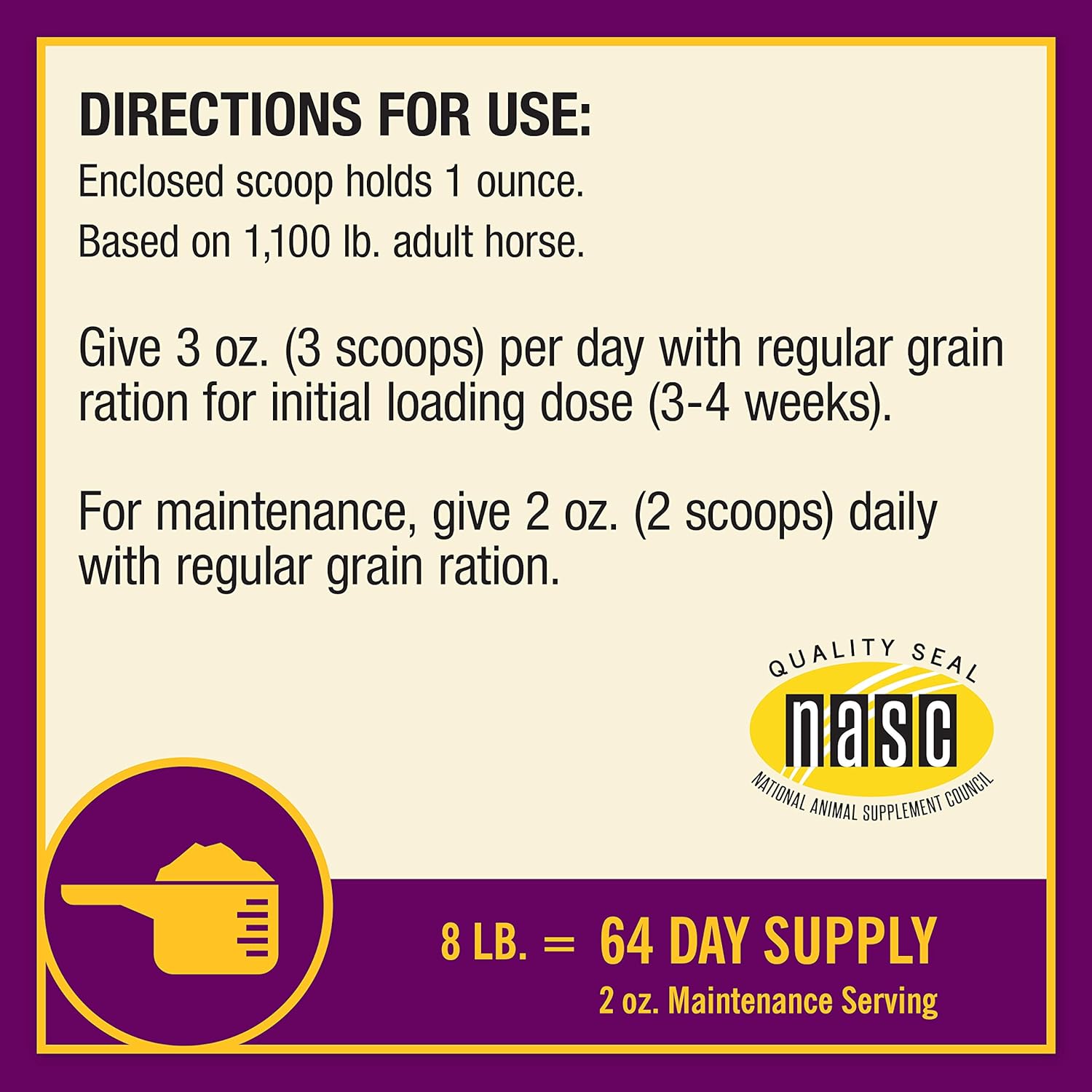 - Directions: Enclosed scoop holds 1 oz. Based on 1,100 lb. adult horse. Give 3 oz. (3 scoops) per day with regular grain ration for initial loading dose (3-4 weeks). For maintenance, give 2 oz. (2 scoops) daily with regular grain ration. . Enclosed scoop holds 1 oz. Based on 1,100 lb. adult horse. Give 3 oz. (3 scoops) per day with regular grain ration for initial loading dose (3-4 weeks). For maintenance, give 2 oz. (2 scoops) daily with regular grain ration.