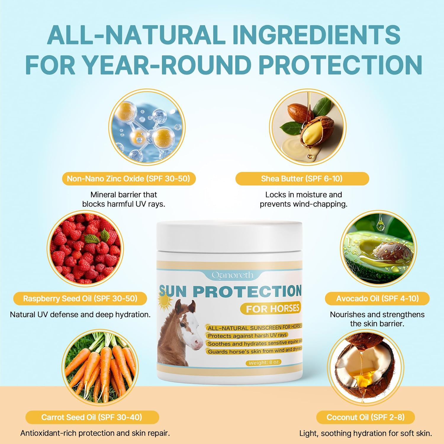 ALL-SEASON SUN & WIND DEFENSE FOR HORSES: Formulated for year-round use, this all-natural horse sunscreen protects your horse’s delicate pink skin, muzzle, and white markings from harsh UV rays, cold winds, and dryness. In winter it prevents cracking and irritation; in summer it blocks UVA/UVB rays—providing reliable, worry-free protection for your horse in every season SUPERIOR MINERAL SUN PROTECTION: Unlike chemical sunscreen for horses with harsh additives, our formula uses non-nano zinc oxide—a safe, mineral-based filter that provides true broad-spectrum UVA/UVB defense. It reflects and scatters sunlight before it reaches the skin to help prevent sunburn and irritation on pink noses and sensitive white areas—reliable daily protection for turnout and trail 100% NATURAL SUN & MOISTURE SHIELD FOR HORSES: More than sun protection, this rich zinc oxide sunscreen horse keeps equine skin hydrated and comfortable all year long. Shea Butter locks in moisture to reduce wind-chapping, Raspberry Seed Oil nourishes and supports the skin barrier, and antioxidant-rich Carrot Seed Oil helps soothe UV-stressed areas—keeping skin soft, healthy, and resilient through every season LONG-LASTING & EASY TO APPLY: Built for busy horse owners, the durable horse sunscreen for nose offers all-day defense against sun and wind, reducing the need for frequent reapplication. It adheres even after drinking or light grazing to maintain coverage on the muzzle and white patches. The smooth, non-greasy texture spreads easily and stays put for quick, mess-free equine skincare VET-TRUSTED, GENTLE FOR DAILY USE: Safe and soothing for sensitive equine areas, this vet-approved horse sunscreen cream can be applied to the nose, ears, around the eye area (avoid direct contact), and any sun- or wind-exposed skin. It keeps horses comfortable in intense sunlight and cold winds—trusted by professionals and loved by owners for year-round equine skin care › See more product details