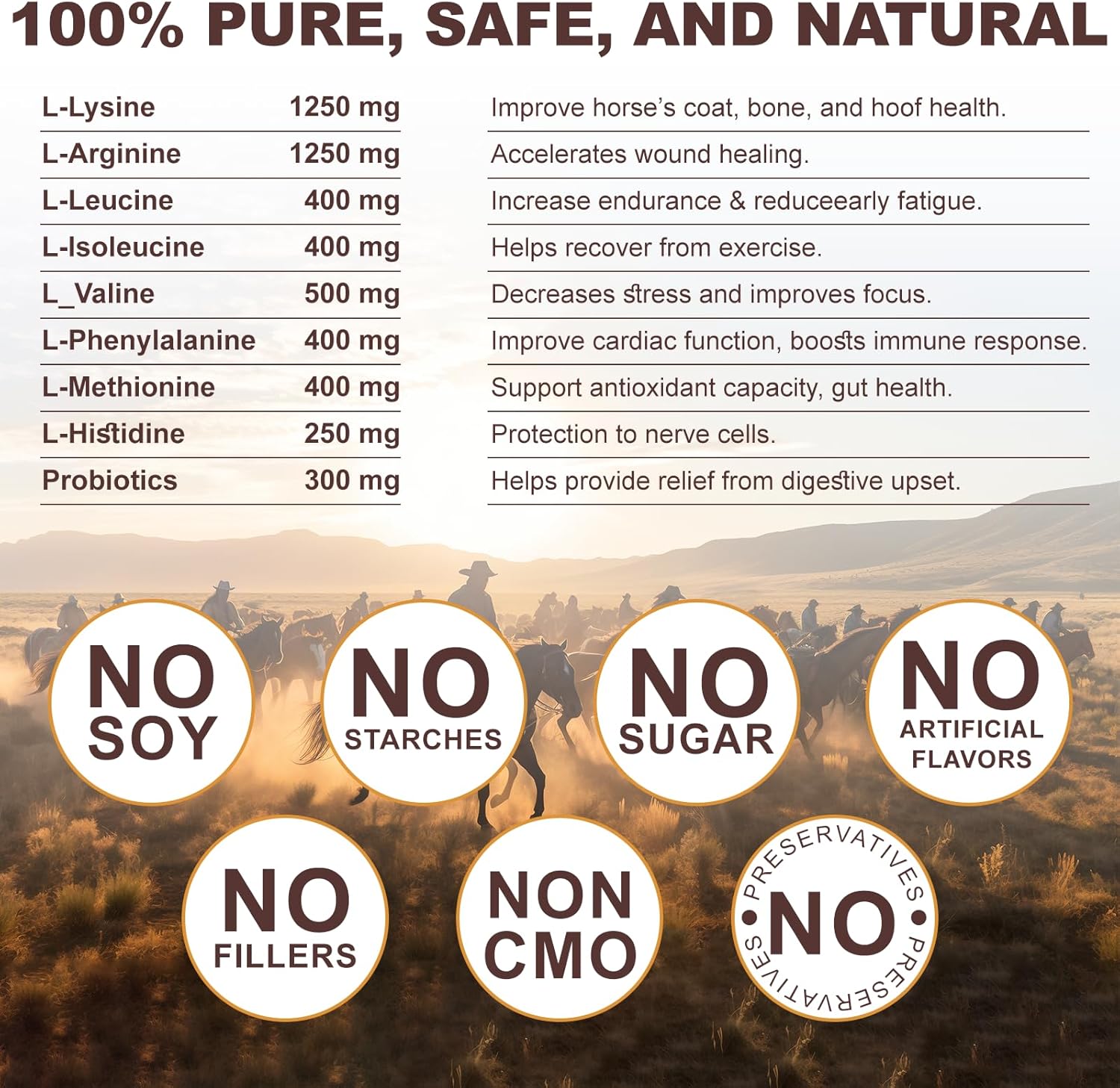 From energy production, to coat health, to muscle recovery, to proper cellular hydration, amino acids provide countless benefits in support of proper health and wellness in horses! Improving Horse's Coat Improving your horse’s coat via increased collagen formation. Enhances Bone & Hoof Health Promoting bone and hoof health by increasing calcium absorption and preventing weak bones. Promoting Muscle Recovery and Growth It helps reduce exercise-induced fatigue and muscle damage, allowing for quicker recovery and enhanced muscular development. Enhancing Endurance and Stamina This amino acids supplement for horses can result in improved performance and prolonged exercise capacity. Assisting with Liver Health Horse supplements aids in assisting the liver in metabolizing, promoting overall liver function and health in horses. Decrease Stress and Improve Focus It can promote the production of norepinephrine and dopamine, thereby reducing stress in horses and improving focus. Feeding Instructions: 1 scoop per day is perfectly OK for horse. Giving 2 scoops per day, If your horse is recovering from an injury/surgery or if you have a performance horse. Amino Acids for horses supplement is 100% safe for pregnant mares to senior/pasture or naments, rescues, performance/working horses and everything in between!