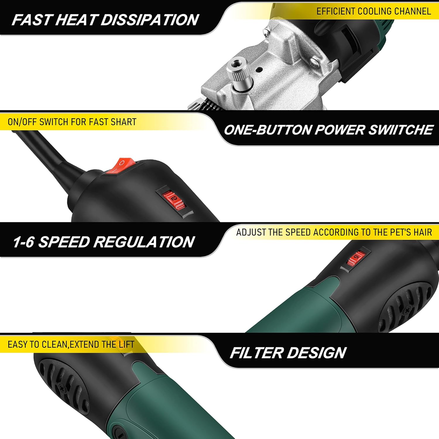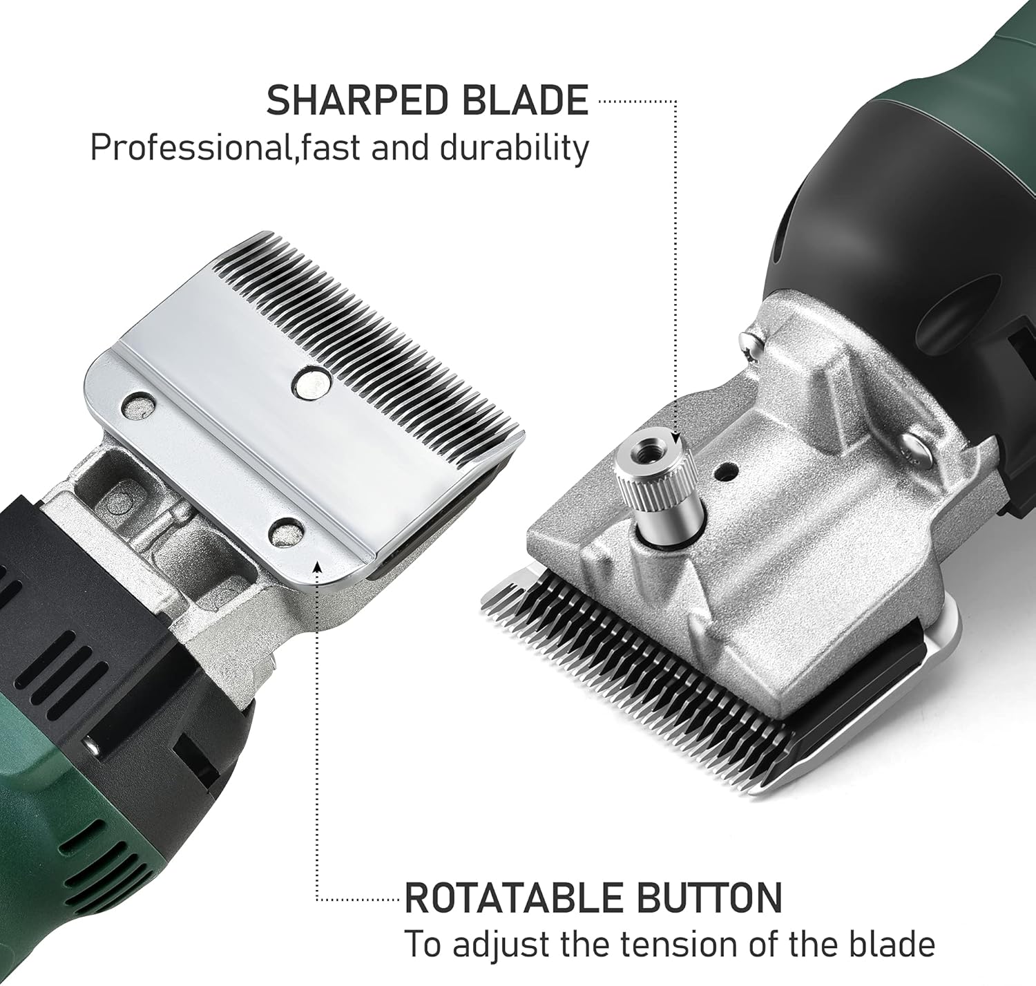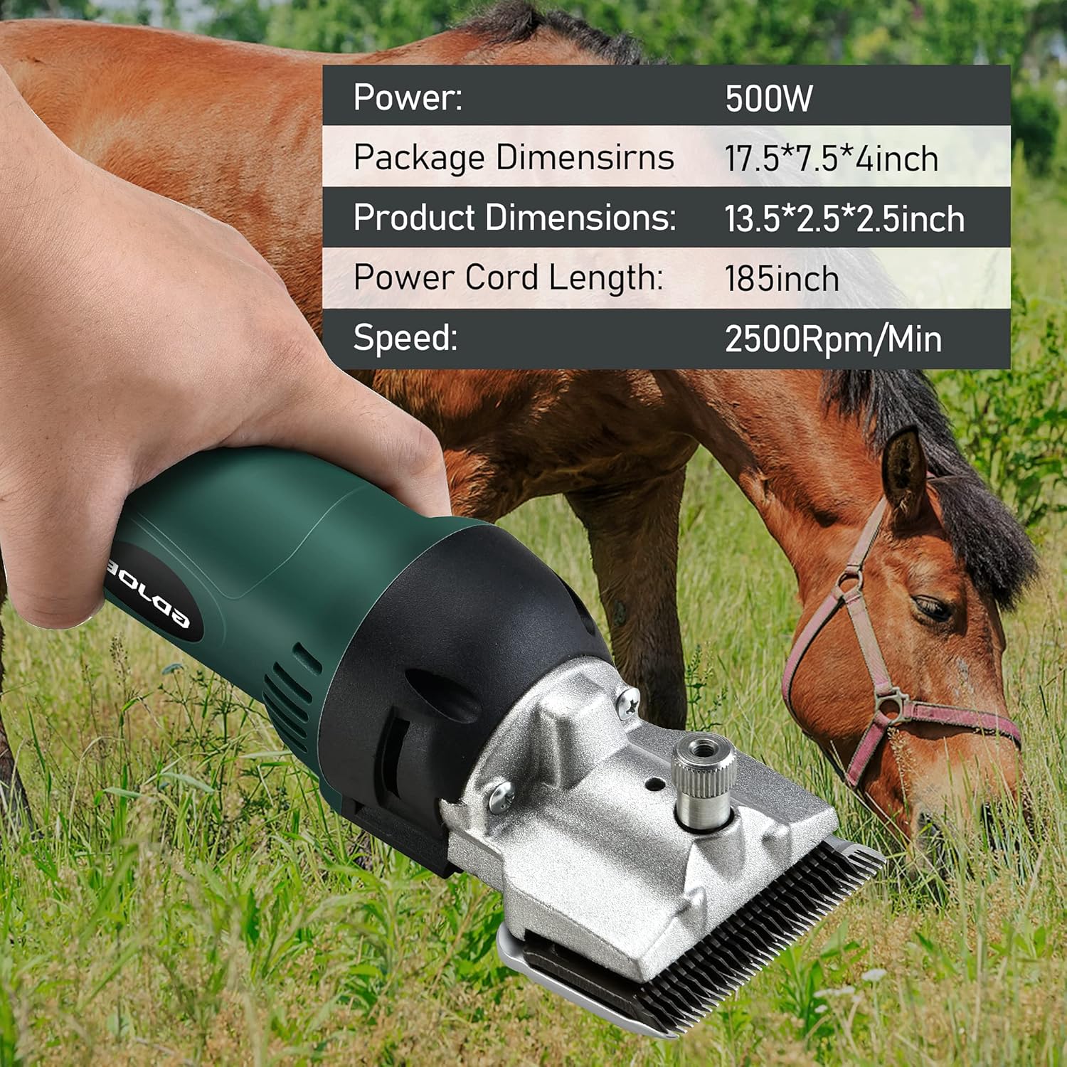 About this item ADVANCED CONFIGURATION: Our professional horse clippers cordless with 500W motor power and variable 6-speed control up to 2400 RPM with comfortable grip protection, making precision scissors suitable for daily cutting. EASY TO USE: This electric horse body clippers has High-Quality Original Beiyuan Blades with a blade tension rotatable button for easy and quick sharing. The rear air intake port has a filter to prevent the inhalation of impurities from damaging the internal motor. SAVE TIME: Can cut 6-10 horse in one hour, suitable for family farming or pasture farming. Labor-saving, the grip structure of the scissors is humanized, and the long-term shearing of the hand will not be fatigued. SUITABLE FOR MOST LONG-HAIRED ANIMALS: Professional horse clippers heavy duty body clipping that meet the needs of the farm, can repair long-haired for goats, sheep, camels, cattle, horses, dogs, rabbits and other animals. LIGHT & PORTABLE: This premium sheep clippers kit includes our dual-blade electric grooming clippers with the head, clipper screwdriver, one cleaning brush, a 5.6m power cord, a bottle of oil, 2 sets of carbon brushes, plus a convenient carrying case.Please use the cooling spray every few minutes, take short breaks during shearing, clean the blade in time, and don't run idle to prevent the blade from overheating. › See more product details