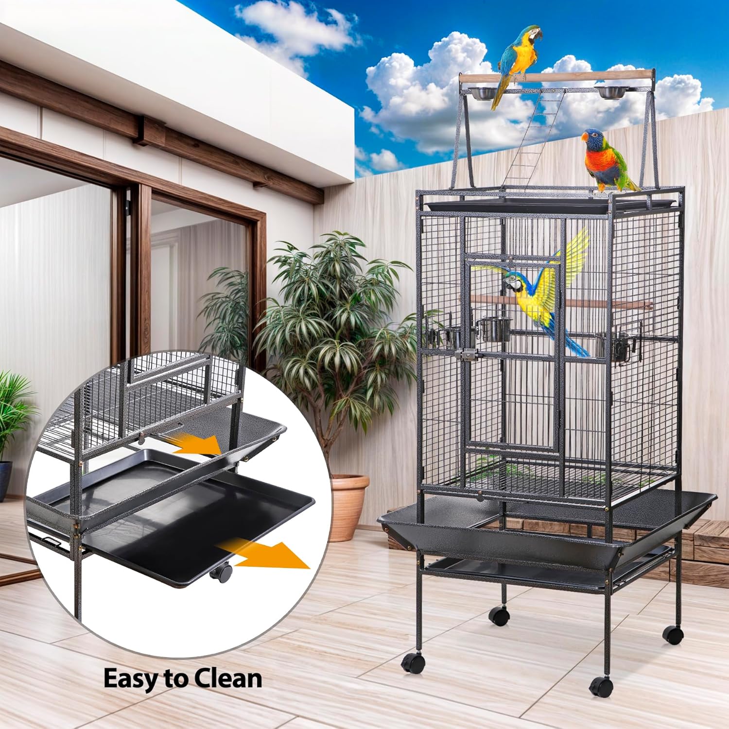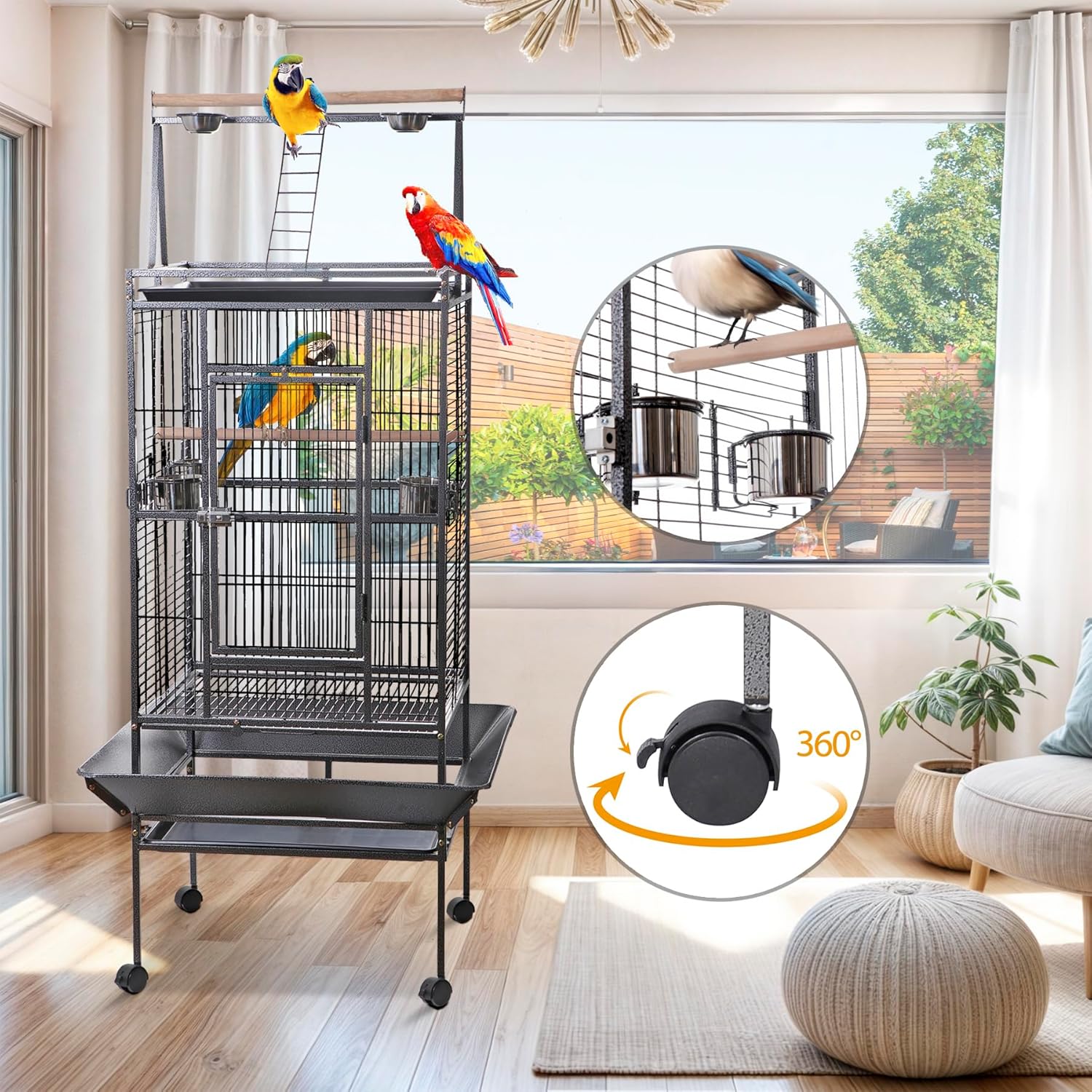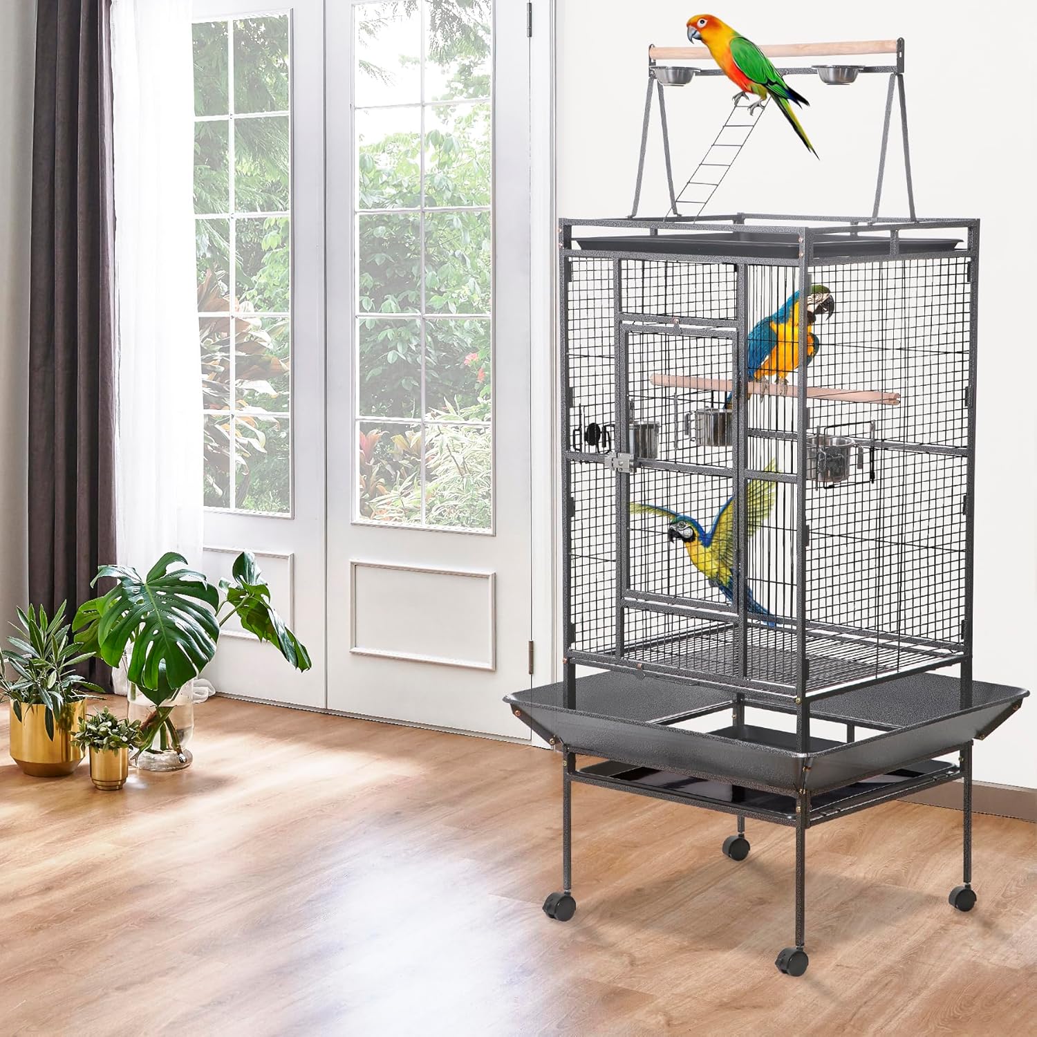 HSM 68 Inch Wrought Iron Large Bird Flight Cage with Rolling Stand Introducing the HSM 68-inch Bird Cage, perfect for lovebirds, canaries, and other similar-sized birds. This spacious cage provides ample room for your feathered friend to spread their wings and move around freely. Crafted with high-quality materials, this bird cage is built to last. The durable wire construction ensures the safety and security of your bird, while the smooth and polished finish adds a touch of elegance to your home decor. The cage comes with two wooden perches, providing your bird with a comfortable place to rest and play.