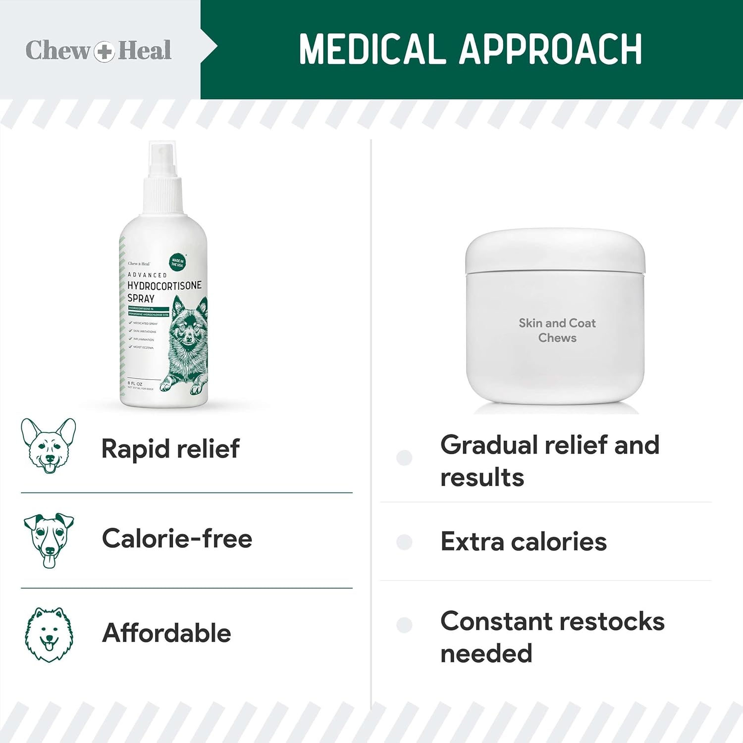 Chew + Heal's Hydrocortisone for dogs can help with skin irritations, hot spots, inflammation, and moist eczema. Our dog itching skin relief spray contains hydrocortisone, known for its anti-itch effects. This can be helpful for soothing things like bug bites and small rashes. This hydrochloride and pramoxine hydrocortisone allergy spray for dogs can also help calm the body's immune response to itching and swelling, which may deter your pup from scratching. To use the hotspot spray for dogs, spray directly on the affected areas and massage the liquid into the skin until its absorbed. Wash hands after use. Don't use more than 3 times a day or as directed by a veterinarian. This spray for dogs' itchy skin comes with 4 fl. oz. (118 ml) of formula per bottle. Made in the USA. Good for all breed types and sizes. › See more product details