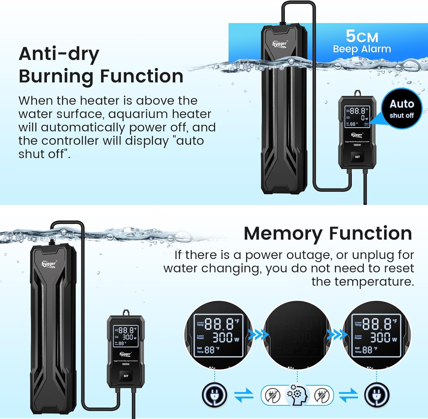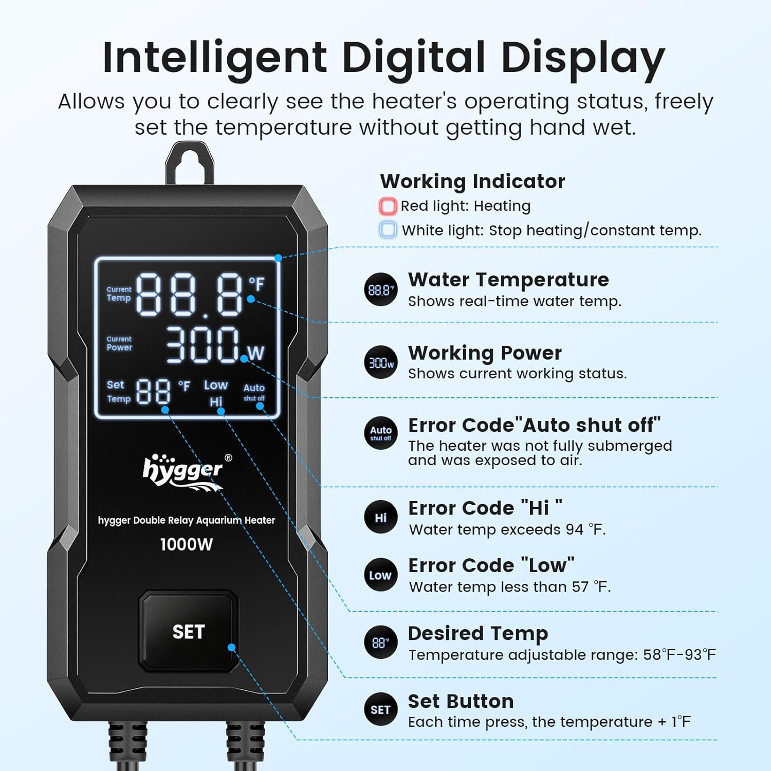 Upgraded Dual Temperature Control System Aquarium Heater: This aquarium heater is equipped with 2 intelligent protector. Even if one protector fails, the other will continue to operate to prevent damage to the product and its circuitry, avoiding overheating and "cooking the fish". This dual protection of the aquarium heater greatly ensures the safety of you and your aquatic organisms Beep Alarm, Comprehensive Protection: This heater has a unique intelligent water and temperature sensor system, providing comprehensive protection: ①Over-temperature alarm: When water temperature exceeds the max temperature 94℉, it shows "HH" and automatically stops heating. ②Off-water alarm: When the water level is lower than aquarium heater's water level, it flashes "Auto Shut Off" and automatically stops heating. ③ When the water temperature is below the min temperature 57℉, it shows "LL" External Controller with LED Digital Display: The tank heater with a LED temperature controller, It clearly shows the real-time water temperature, set temperature, operating power, error codes, and heating status. You can monitor the water temperature and set temperature in real time. Variable temperature settings range: 58-93℉. Each press will change 1℉. The external control reduces the risk that water gets in and burn out the heater, and allows you to adjust the heater without getting hand wet Premium Safety & Durability: This fish tank heater uses explosion-proof quartz glass, combined with a high-temperature resistant nickel-chromium heating wire and a quartz sand heat conduction, resulting in faster water heating and more even heat distribution. The strong black ABS protective shell is easier to hide, and effectively protecting both you and your aquatic pets from scalding 800W Aquarium Heater for 80 to 220 Gallons: The 800 watt aquarium heater produces stable power with quick heat up. It's length is 10.8'', power cord is 10.1ft. It is suitable for 80 to220 gallons tank, can be used for saltwater and freshwater aquariums, fish tanks, turtle tanks, small ponds, and so much more. Please select the appropriate heater according to our size chart. If there is any problem with our product, please contact us, we are happy to provide you with after-sales service. › See more product details