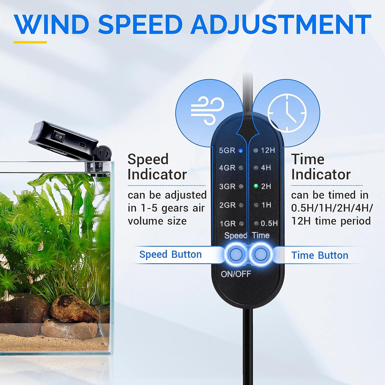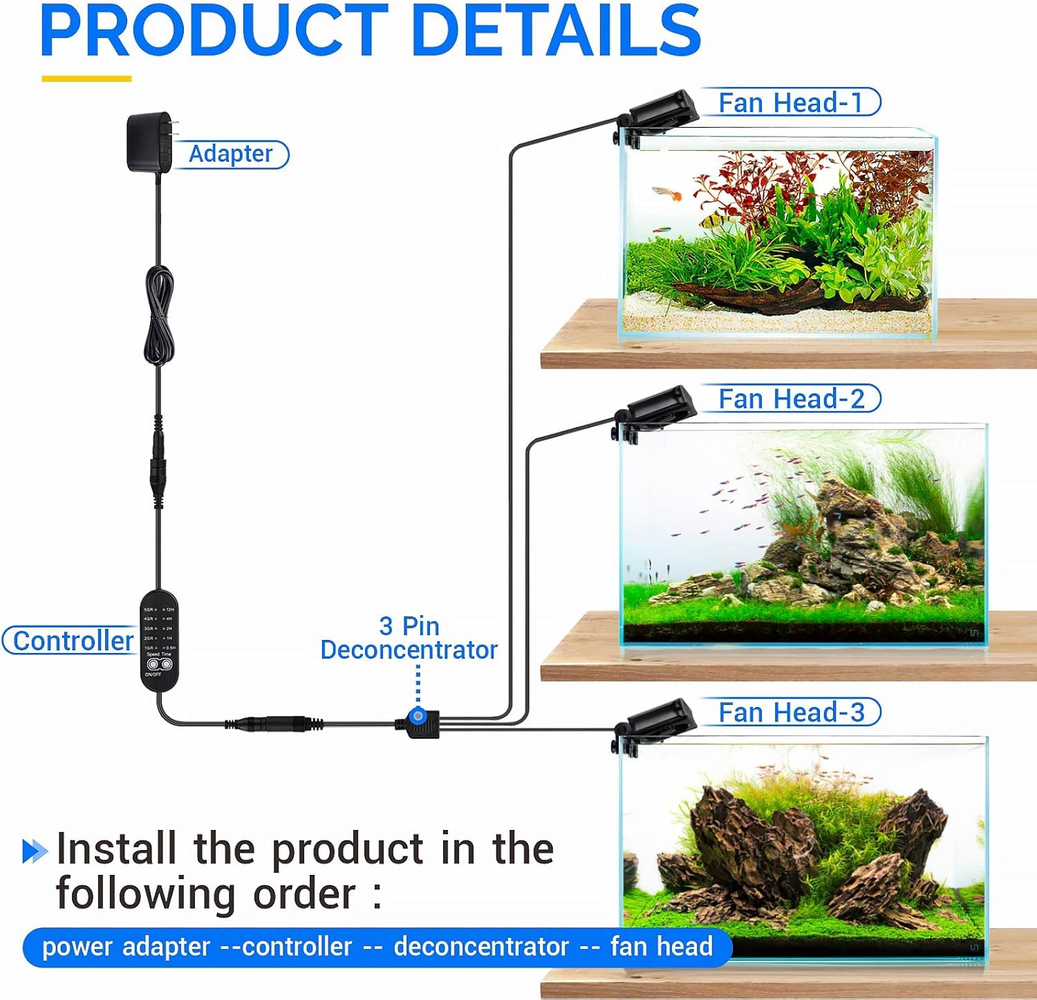 About this item INDISPENSABLE REASON: In addition to being affected by the hot summer weather, and the air in the basement garage and other places is not circulated. The aquarium fish tank also generates a lot of heat every day, which comes from the water pump, the built-in filter, the wave pump and other equipment, especially the aquarium light, which emits the most heat. Coral tanks especially need to pay attention to water temp. So hygger aquarium chiller fan is a good choice, energy-saving and silent USEFUL FISH PRODUCT: In addition to the unique functional creation (timer/wind speed setting) of the hygger cooling fan, its own quality is also worthy of recognition. ABS plastic shell, sturdy and beautiful. The all-copper core motor and FDB bearings bring a big comfortable wind feeling while the working sound is not disturbing 5 LEVELS OF WIND: Not only need aquarium cooling equipment in hot summer, but also need it all year round. The hygger fish tank cooling fan has 5 levels of wind speed, can be used according to different environmental scenarios. In summer, if there is no air conditioner and other cooling equipment, you can use the 5th gear. Use 1/2/3/4 gear wind in spring/fall/winter Easy to use: fixed by strong plastic screws, it can be hung on the wall of the fish tank less than 0.45 inches thick, safe and stable. The angle of each independent fan head can be adjusted freely, no need to worry about angle restrictions, you can blow wherever you want. In addition, hygger's unique 3 pin deconcentrator cord design can satisfy fan heads placed on1~ 3 tanks, and one controller and power cord can control AUTO ON/OFF: Aquarium fan has its own timer setting, which can be selected from 0.5H/1H/2H/4H/12H through an external controller. When the temperature cools down at night, or the refrigeration equipment is turned on, the fan can be stopped during this period of time. It is not necessary to turn it off manually every time. The timer function can perfectly solve this problem › See more product details
