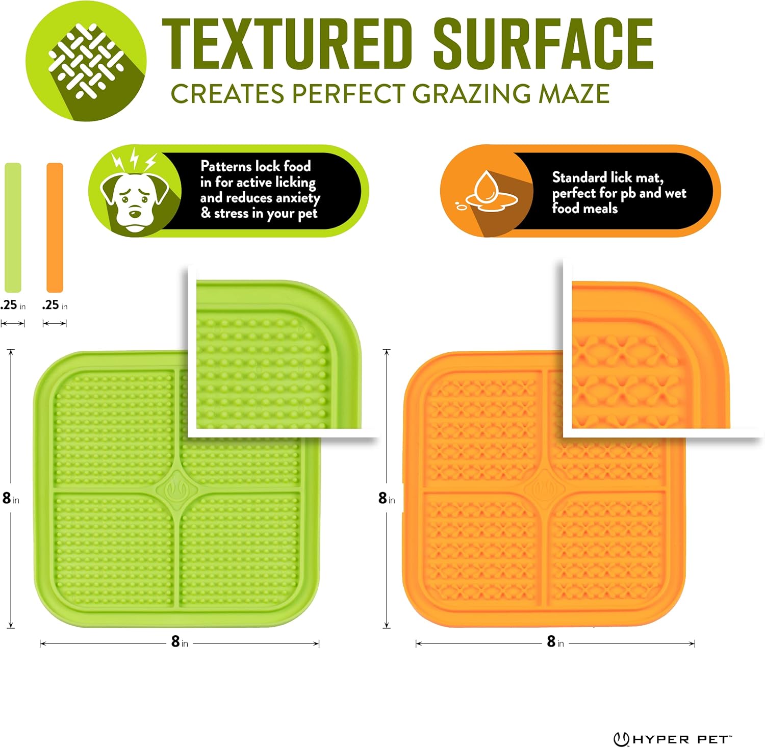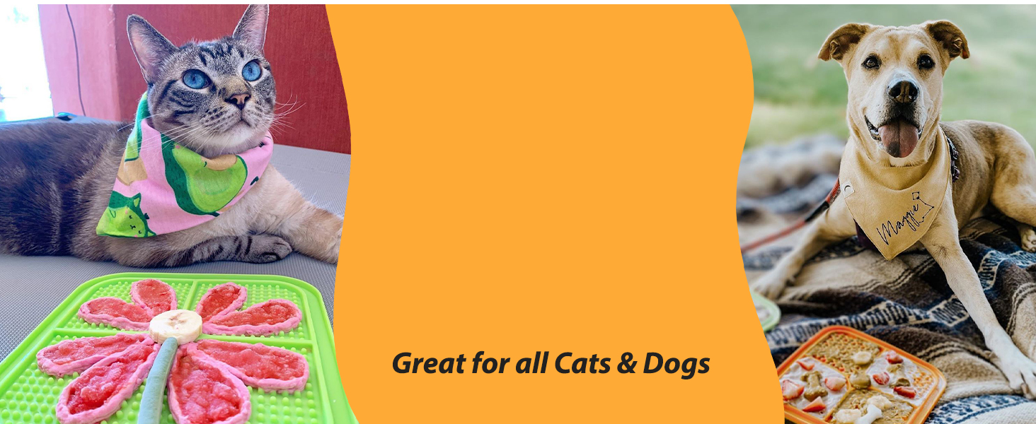 About this item YOUR PET WILL LOVE IT: Studies show repetitive licking increases endorphins, which in turn calms your pet helping dog anxiety. A great alternative to slow feeder dog bowls use our dog food mat to curb destructive behaviour during stressful times. YOU WILL LOVE IT: This dog treat puzzle & cat treat puzzle companion provides tons of interaction with your best friend as a great boredom buster. To reward them just add dog peanut butter, pumpkin, or yogurt. FUN HEALTH BENEFITS: Great for cat and dog dental care at home, our dog lick mat and cat food mat promotes fresh breath by scraping the tongue. It also improves digestion by slowing down their eating. Just sprinkle dog calming chews - anxiety relief treats as a special snack. THOUGHTFUL DESIGN: Our quadrant design helps guide portion control when spreading cat food, dog treats, dog snacks, or wet dog food on our dog lick pad. The raised patterns provide different texture options sure to keep your pet engaged. Not meant for aggressive chewers. DURABLE: Easy to clean and top rack dishwasher safe. Always supervise your pet whilst using. › See more product details