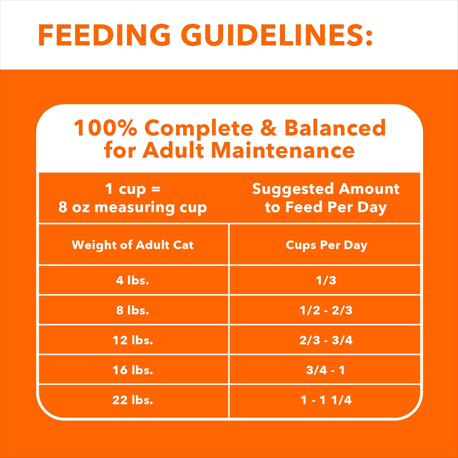 - Directions: Suggested Amount to Feed per Day Based on Weight of Cat 4lbs. = 1/3 cup 8lbs. = 1/2-2/3 cup 12lbs. = 2/3-3/4 cup 16lbs. = 3/4-1 cup 22lbs. = 1-1 1/4 cup These guideline amounts are a starting point and your cat may need more food depending upon age, activity and temperament. In order to reach optimal body condition, you may need to adjust food intake. This represents the total recommended volume of food per day. You should divide the total recommended feeding amount by the number of times you feed your cat per day to get the actual portion size per feeding. • If you have a kitten, pregnant or nursing cat, we recommend feeding IAMS kitten food. • Remember to have clean, fresh water available for your cat at all times. • Because IAMS Hairball Care cat food is complete and balanced for maintenance, you do not need to add vitamin or mineral supplements. • When introducing IAMS cat food, gradually mix it with your cat's current food over the course of 4 days.