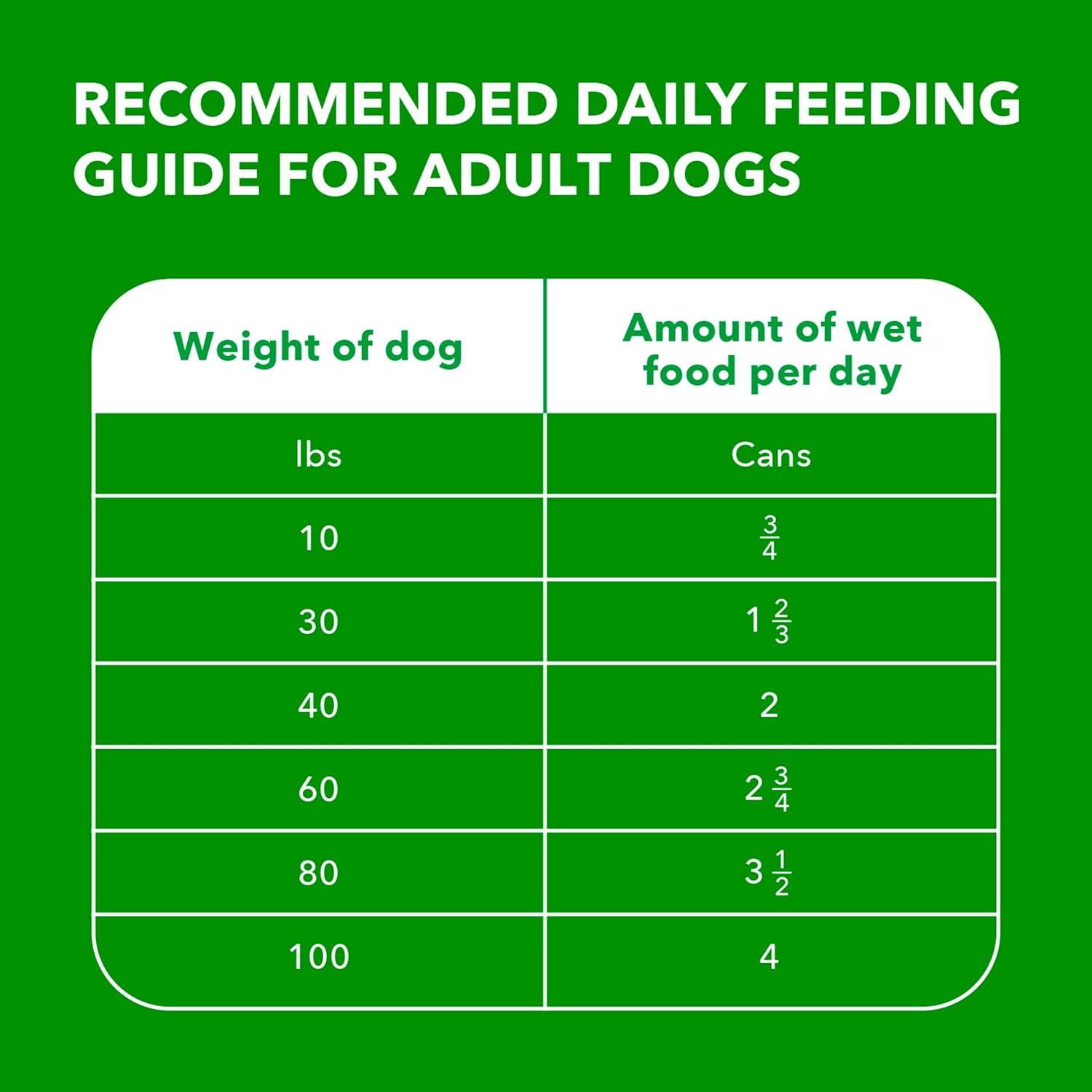 - Directions: Suggested Amounts To Feed Per Day *1 can = 13 oz. Weight of Adult Dog (lbs.) 10 30 40 60 80 100 Cans per Day When Fed Alone*3/4 1 2/3 2 2 3/4 3 1/2 4 Amount of food your dog requires will depend on activity, age, environment and breed. Feed at room temperature and refrigerate unused portion. Always provide access to clean, fresh water.