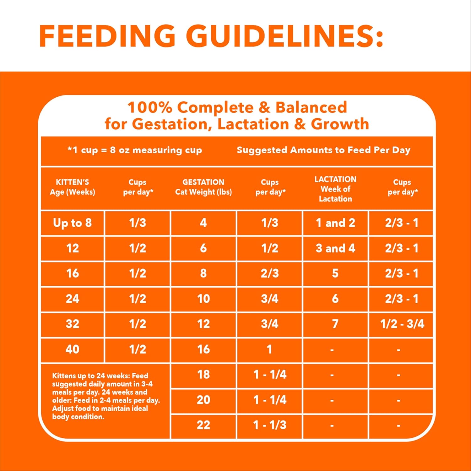 - Directions: Suggested Amount to Feed per Day Based on Age (Weeks) of Kitten Up to 8 weeks = 1/3 cup 12 weeks = 1/2 cup 16 weeks = 1/2 cup 24 weeks = 1/2 cup 32 weeks = 1/2 cup 40 weeks = 1/2 cup Kittens up to 24 weeks Feed suggested daily amount in 3-4 meals per day. 24 weeks and older Feed in 2-4 meals per day. Adjust food to maintain ideal body condition. Suggested Amount to Feed per Day Based on Weight of Cat during Gestation 4lbs. = 1/3 cup 6lbs. = 1/2 cup 8lbs. = 2/3 cup 10lbs. = 3/4 cup 12lbs. = 3/4 cup 16lbs. = 1 cup 18lbs. = 1 1/4 cup 20lbs. = 1 1/4 cup 22lbs. = 1 1/3 cup Suggested Amount to Feed per Day Based on Week of Lactation 1-2 = 2/3 - 1 cup 3-4 = 2/3 - 1 cup 5 = 2/3 - 1 cup 6 = 2/3 - 1 cup 7 = 1/2 - 3/4 cup 16lbs. = - 18lbs. = - 20lbs. = - 22lbs. = - These guideline amounts are a starting point and your kitten may need more food depending upon age, activity and temperament. In order to reach optimal body condition, you may need to adjust food intake. This represents the total recommended volume of food per day. You should divide the total recommended feeding amount by the number of times you feed your kitten per day to get the actual portion size per feeding. • If you have a kitten, pregnant or nursing cat, we recommend feeding IAMS kitten food. • Remember to have clean, fresh water available for your cat all times. • Because IAMS HEALTHY KITTEN cat food is complete and balanced for maintenance, you do not need to add vitamin or mineral supplements. • When introducing IAMS kitten food, gradually mix it with your cat's current food over the course of 4 days.