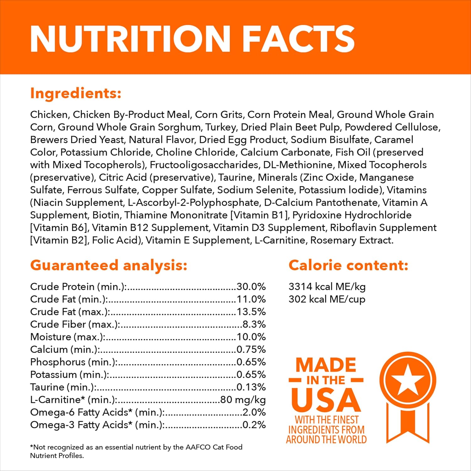 Crafted to support the optimal health of your indoor cat, IAMS Proactive Health Indoor Weight Control & Hairball Care Adult Dry Cat Food with Chicken & Turkey is an everyday meal that’s 100% complete and balanced. This wholesome, tasty cat food recipe is made with real chicken, turkey, and healthy ingredients that provide essential nutrients for your indoor cat. IAMS Proactive Health indoor cat food is formulated with a proprietary fiber blend with beet pulp that helps reduce hairballs before they start, making this the perfect hairball control cat food. To further support your indoor cat’s health, this kibble is specifically formulated with L-carnitine to help burn fat and maintain a healthy metabolism. Flavorful, nutrient-rich, and formulated for every stage of life, it’s no wonder veterinarians recommend IAMS cat food. Help keep your cat healthy, happy, and playful for life with tailored nutrition from IAMS cat food.