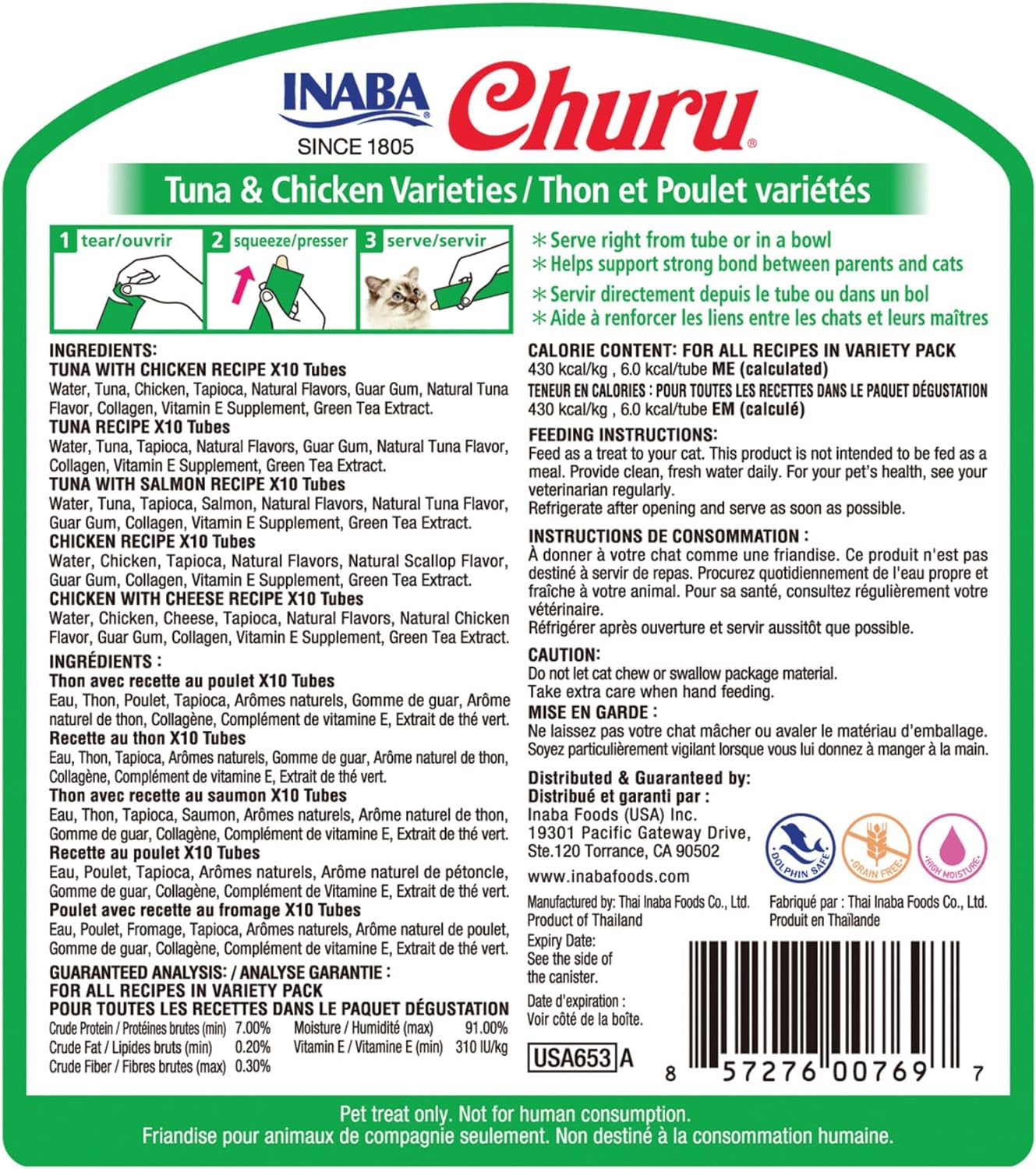 Here at Inaba, we know your cat is a beloved family member. That's why each of our Churu Lickable Creamy Purée Natural Cat Treats are made from high-quality ingredients, including wild-caught tuna and farm-raised chicken. Since cats are not naturally drawn to water, we have made these a high-moisture, low calorie cat treat that your kitties will love. They contain 91% moisture and have only 6 calories per tube. That's a tenth of the calories of traditional dry cat treats and more than 10 times the moisture (8% vs. 91% moisture). In addition, we've also added Taurine to help with their vision, digestions and heart health, as well as, Vitamin E for immunity and Green Tea Extract for its natural antioxidants. What they're missing? They're grain-free, preservative-free, carrageenan-free and free from artificial colors, making them a cat treat you can feel good about feeding. Designed to be hand fed, you can use to help calm the feistiest of outdoor ferals or treat your pampered indoor pussycat. They can be used a dry/canned cat food topper or to assist with giving medications. Available in 19 savory flavors, you'll be able to find a flavor that your kitty will crave no matter what stage of life they are (kitten to senior). Inaba Churu makes snack time fun for you and your feline friends.