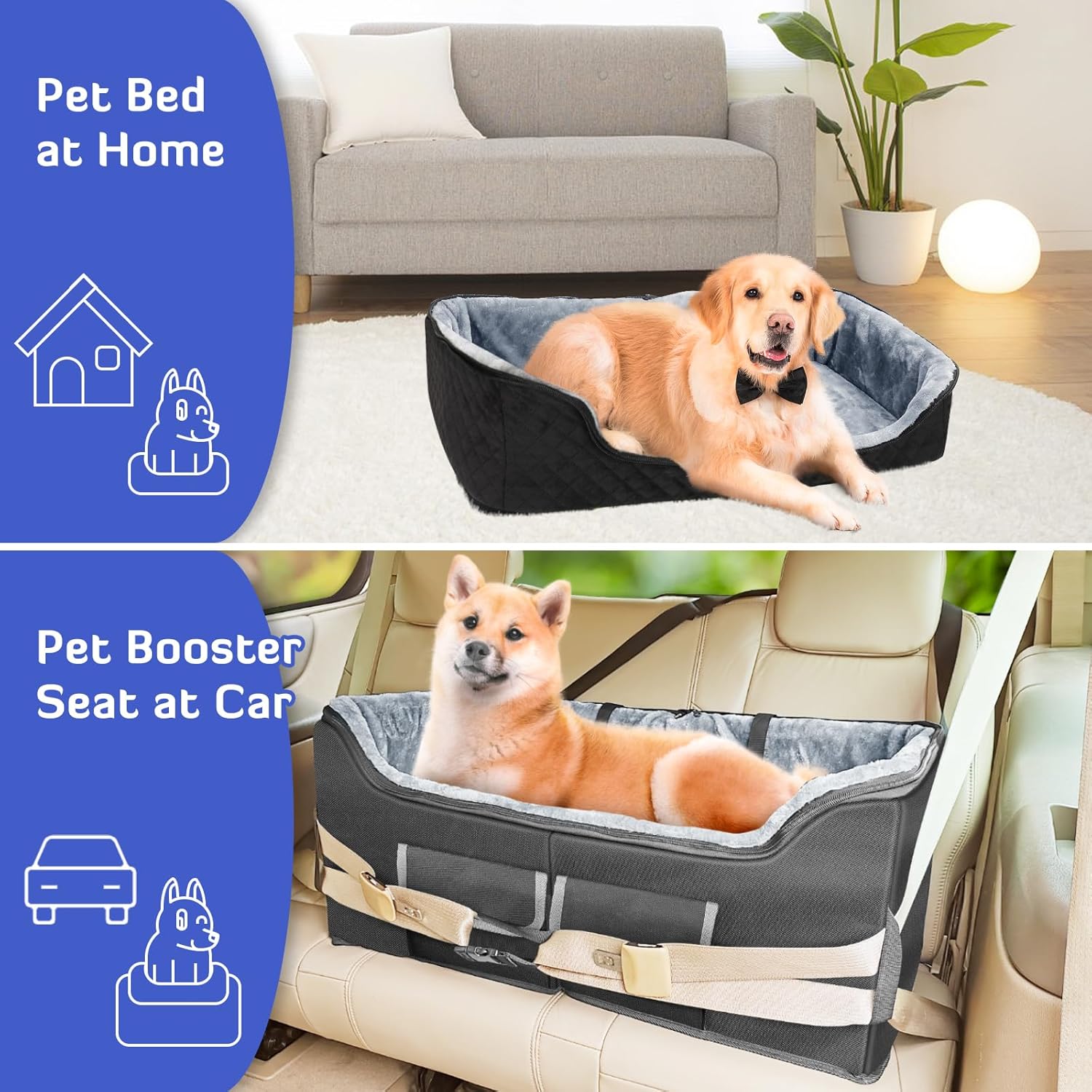 About this item 【Large Space for Your Dog】The INFANZIA dog booster car seat for large dogs has dimensions of 30'' L x 17'' W x 13'' H, making this doggy car booster perfect for large-sized dogs weighing 55 pounds or less, and also fits up to 2 Medium dogs. Before purchasing, please measure your puppy to find the most suitable seat size. 【Universal Year-Round】Made of durable 600D Oxford cloth material and used together with the plush cushion, this puppy car seat booster can be connected to the cushion with a zipper. The cushion of the doggie car seats is reversible, with Oxford cloth for summer and plush for winter, creating a comfortable environment for your pet all year round. 【Unique Elevated Design】When traveling with your medium dog or cat, our pet booster car seat provides a window view for your nervous or car-sick pet. The unique elevated design allows your pet to gaze outside and enjoy the journey, with 2 safety loops to attach your pet's harness so it won't jump out, making your travel safer and more comfortable. 【Easy to Install and Carry】INFANZIA large dog car seat booster can quickly installed and removed on the rear seat of the car, the sturdy structure and internal multi-piece thick support board ensure the shape and stability of the entire seat. And the foldable design makes the elevated dog seat easy to store when not in use. The dog travel seat also features an adjustable buckle design that can be quickly installed on most standard car seats, suitable for a variety of car models. 【Multiple Use】The pet car seat can not only be used as a lookout dog car seat, but also as a dog bed at home. You can keep pet equipment in the pockets in front of the dog seat, keeping your car and home tidy and saving space. › See more product details