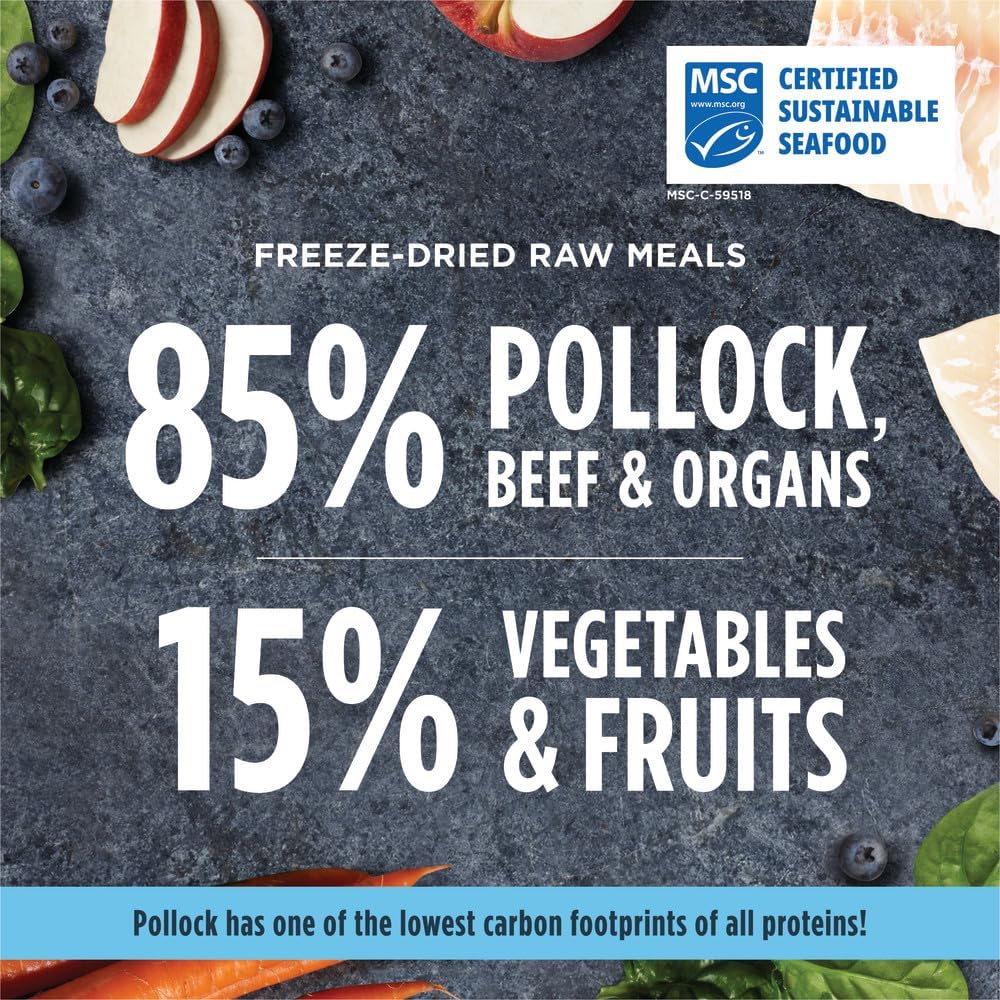 Instinct Freeze-Dried Raw Meals Grain-Free Pollock Recipe is a healthy dog food that provides a superior alternative to traditional kibble. Featuring 3x more real fish, meat and nutrient-rich organs than Instinct Original Kibble, this raw dog food delivers complete, balanced nutrition for a happier, healthier pup. Unlike traditional dry food, our freeze dried dog food recipes are never cooked. This preservation method maintains full nutritional integrity, resulting in complete and balanced high protein dog food made with the pure, real nutrition of raw. Freeze dried raw dog food retains more natural flavor and nutrients than kibble, offering the same nourishment found in fresh dog food but in a convenient shelf-stable form. This freeze dried food supports lean muscles, digestion, and vibrant skin and coat and is made without grains, corn, wheat, soy, legumes, or artificial colors or preservatives. Harness the power of raw ingredients with Instinct dog food—minimally processed natural dog food made in the USA with the finest ingredients from around the world.