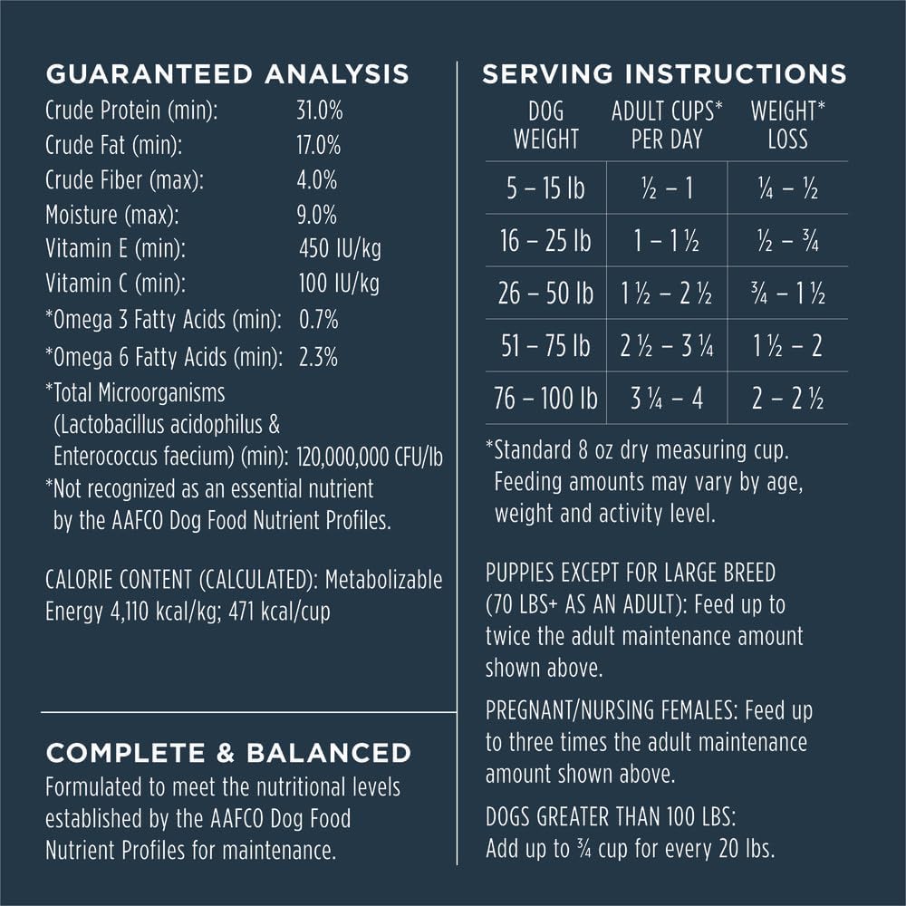 - Directions: Ideal feeding amounts will vary by age, weight, and activity level so the guide below should be used as an initial recommendation. Divide the cups per day by the number of feedings per day. Be sure to always provide clean, fresh water. Along with dry food, we recommend feeding raw or wet food to help increase the amount of water in your pet’s diet. Daily Feeding Guidelines (standard 8 oz dry measuring cup) Adult Maintenance (cups per day) 5-15 lb ½ - 1 cup; 16-25 lb 1 – 1 ½ cups; 26-50 lb 1 ½ - 2 ½ cups; 51-75 lb 2 ½ - 3 ¼ cups; 76-100 lb 3 ¼ – 4 cups Weight Loss (cups per day) 5-15 lb ¼ - ½ cup; 16-25 lb ½ - ¾ cup; 26-50 lb ¾ - 1 ½ cups; 51-75 lb 1 ½ - 2 cups; 76-100 lb 2 – 2 ½ cups Dogs greater than 100 lbs add up to 3/4 cup for every 20 lbs. Transitioning to Instinct Always introduce a new food over a period of 5 to 7 days, mixing increasing amounts of Instinct with the current food each day. Visit the Instinct Pet Food website for more specific feeding recommendations and information on how to easily combine different forms of food.