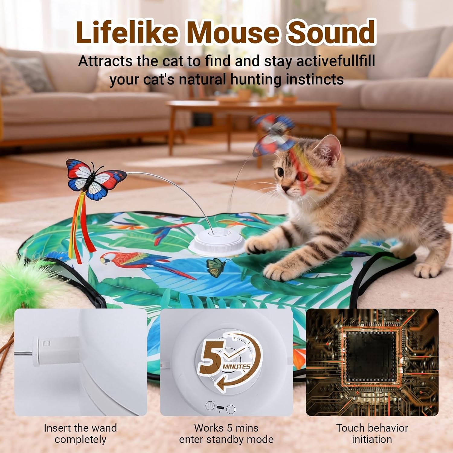 Automatic Cat Toy: An interactive cat toy designed with realistic mouse sounds and moving feather sticks. The feathers quickly hide and move under an irregular cover, repeatedly appearing and disappearing to start a game of hide-and-seek. The sound-emitting bait will drive your cat crazy, encouraging them to search, hide, and chase. It features 3 built-in realistic prey sounds (bird chirping/mouse squeak/bug buzzing) to replicate the soundscape of the wild, with an independent sound control switch! You can mute it when you want your cat to play quietly. Triangular Anti-Tip Suction Cups with Anti-Roll Cover: The bottom is upgraded with a strong three-point suction cup triangular layout, making it very stable! The suction cups also secure the edges of the cover, completely preventing tangling or tipping over! Three-Axis Linkage: The original single rod is upgraded to a 'dual main rods with central butterfly secondary rod', allowing multiple cats to play together without fighting! It covers a larger area and doubles the fun time. Provides 3 working modes, easily switched with a button: Blue (Normal), Purple (Fast), Yellow (Hunt). After 5 minutes of operation, it enters a resting mode and can be reactivated by tapping. If not touched for one hour, it will automatically turn off. USB Rechargeable Cat Toy: Long battery life with an 1800mAh 3C battery. Playing one hour a day requires charging only once every 8 days, far surpassing standard batteries. A USB cable is included in the package. The feather stick is easy to install, allowing play anytime, anywhere. No need to worry about the toy running around the room or getting lost.