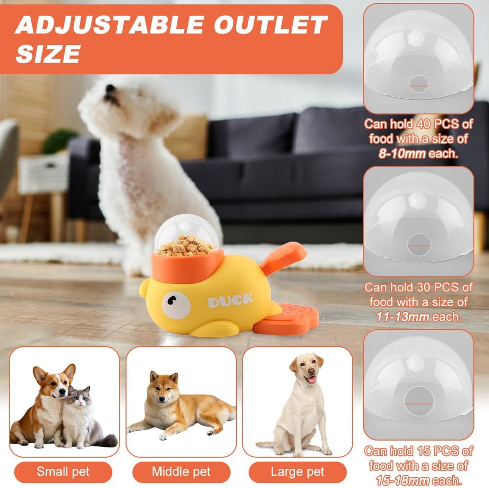 Transform mealtime into a brain game with our Duck-Shaped Interactive Treat Dispenser Toy! Designed to slow down eating and stimulate your pet's mind, this innovative feeder:Fun and Interactive Dining: This slow-feeding dog bowl with a treat-dispensing function is a fun educational toy for your pet. It combines slow feeding with fun interactions and randomly releases treats, making mealtime more enjoyable and rewarding.Duck-Shaped Feeding Bowl: This two-in-one interactive toy, designed like a duck, features a sleek, adorable appearance that attracts your pet's curiosity, while the unique dispensing design provides a unique way to feed your small or medium-sized dog or cat.Push-to-Feed: This interactive dog toy uses a push-to-trigger design, requiring your pet to press the duck's tail to access treats. Do not overfill the bowl, as the pressure applied to the pedal will affect the distance the treats are dispensed.Adjustable Dispenser Size: The interactive dog toy comes with three transparent lids with different apertures, ranging from 0.39 inches, 0.51 inches, and 0.70 inches.Material: PlasticDimensions: 23*12*10cmPackage Included:1pcs x Dog Interactive Treat Dispenser Toy2pcs x anti-slip stickers