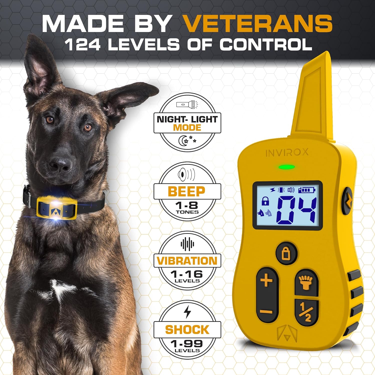 About this item Limitless K9 Gear- Top-Notch dog training collar with remote Designed By Veterans featuring 124 training levels; Night-Light mode, beep (1-8) vibration (1-16) and shock mode (1-99). Take It To The Next Level with an ergonomic remote & 2 ways to wear; belt clip & lanyard. Lab & Field Tested- Safe Training Collar For Dogs - No accidental shock with a keypad lock. Award-winning E Collar provides precise stimulation & Full adjustment to a level that is best suited to gently communicate with your furry friend. 100% Waterproof System- IP67 Dog Shock Collar With Remote - IP65 for MAX Performance in ANY weather conditions. The ULTRA K9 E Collar For Dogs Training is suitable for 8 lbs~150 lbs size dogs. Unleash A ¾ Mile Range- Best shock collar for large dogs let you train your dog like a PRO 24/7 Customer Service & 1-Year Warranty - lasts up to 45 days & the shock collar with up to 15 days operation per single charge › See more product details