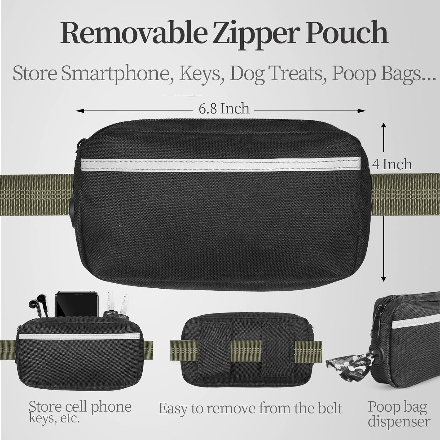About this item Removable Zipper Pouch: Easily store and access your smartphone, keys, poop bags, dog treats in the removable zipper pouch. It’s a good add-on for the leash for training, walking, jogging, hiking training and running Double shock absorbers: Feature 2 shock-absorbers to help provide a bit of “give” in the leash. This can help reduce the amount of tugging both you and your dog will experience as you cruise down the road Durable clip - Enjoy a 2” heavy duty clip for added safety and handy D-ring to attach your favorite dog training clicker or dog poop bag holder. 2 Extra handles for extra control: Easily guide your pup on your runs through the park with the built in waist handle. Then switch to the amazing traffic handle when you need tighter control of your pet. Hand free waist wearing: Enjoy a waist dog running leash belt that lets you freely use your phone or read a newspaper without feeling restrained by your Dog's movements Length adjustable waist belt: The waist belt length is adjustable from minimal 27 inch to maximal 48 inch. › See more product details