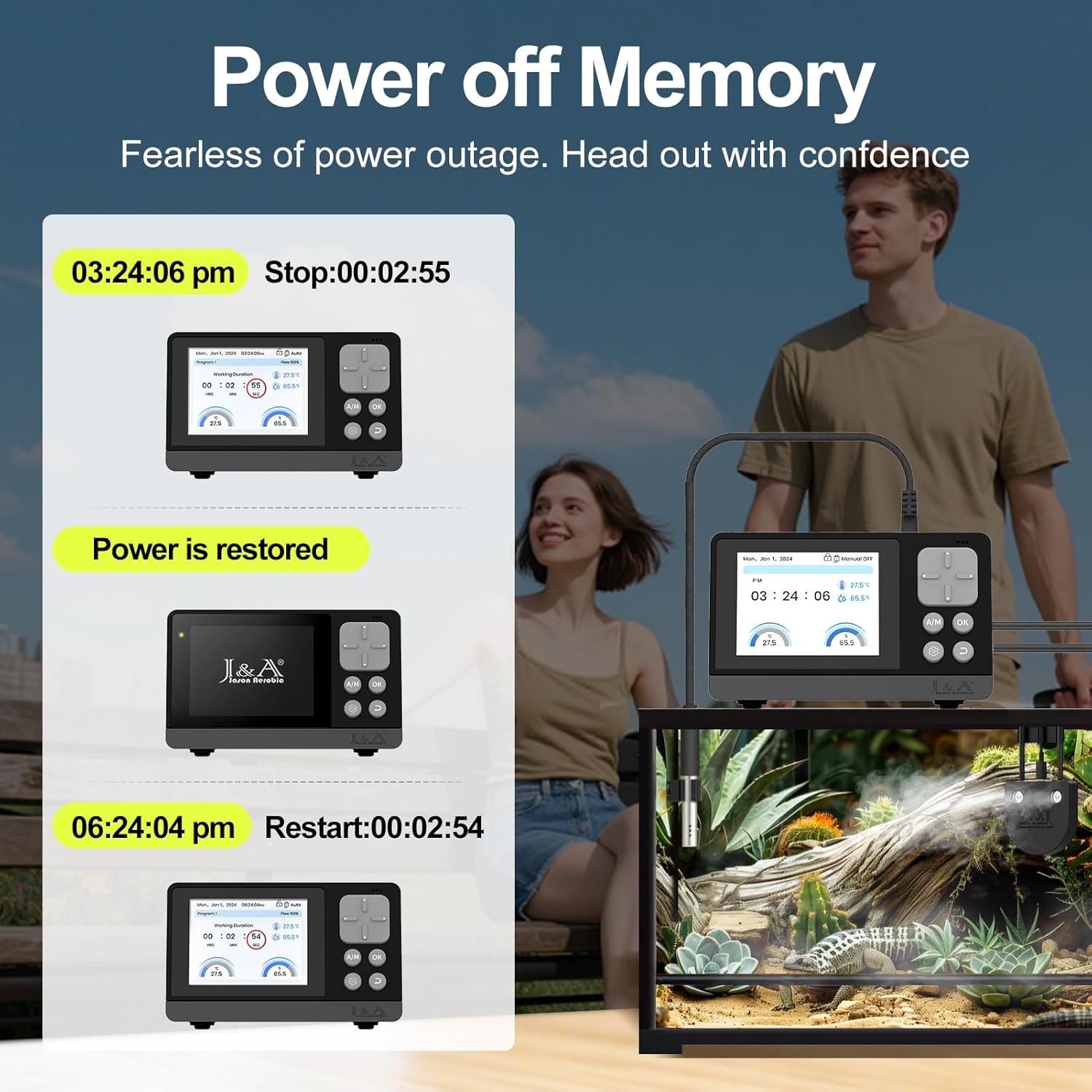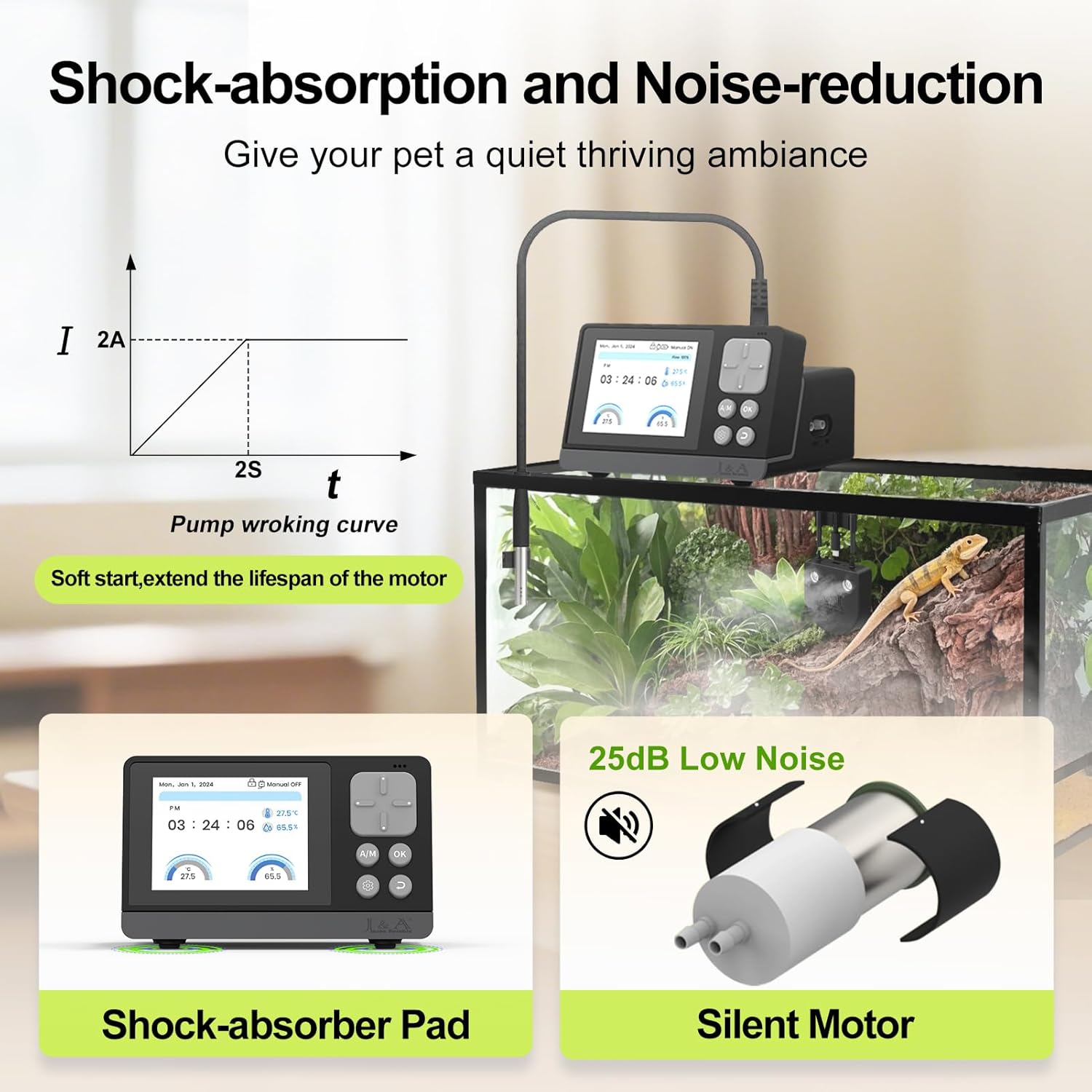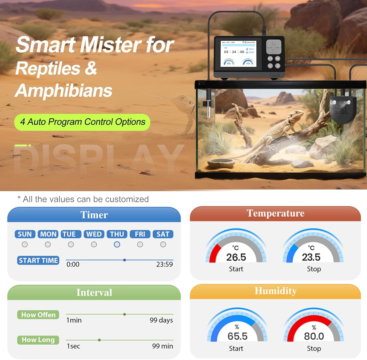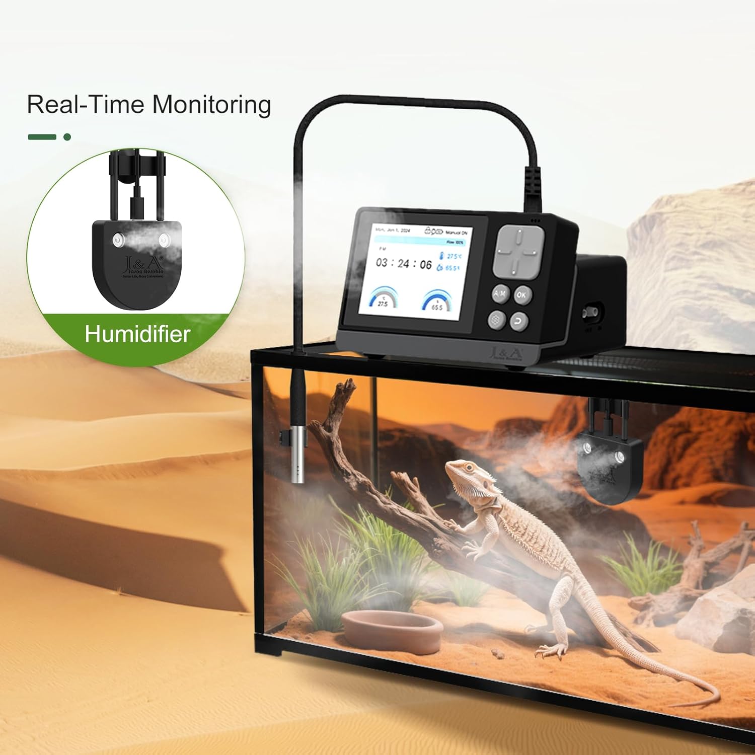 About this item User's interface designed simply, 2.8″LED screen displays real-time status, tracking and showing habitat conditions continuously, ensuring you stay informed about the performance of the system at a glance High sensitivity digital integrated Temp-Humidity probe monitors moisture levels, automatically adjusting fog output to maintain ideal environment for reptiles and amphibians. No need for additional temperature and humidity meters No fog gathering, no water tank design, the water tank is not limited by its own capacity, produces fine mist that quickly raises humidity levels while preventing excessive condensation in your terrarium or vivarium. Suitable for various terrarium sizes 4 automatic program control options: - giving you the flexibility to customize the atomization schedule; - allowing you to set specific humidification intervals (adjustable from 1s to 99d); and - Intelligent start - stop based on set environmental monitoring value Power-off memory function ensures the humidifier resumes operation immediately upon power restoration, this feature guarantees uninterrupted program control, maintaining optimal environmental conditions to support the health and well-being of your terrarium inhabitants What will you get? Controller*1, T/H sensor probe*1, Sensor probe suction cup*1, Tubing clip*1, Filter*1, Tube(16.4ft)*1, Humidifier*1, Suction cup*2, USB-C cable*1, Type C-C cable*1, User’s Manual*1 › See more product details