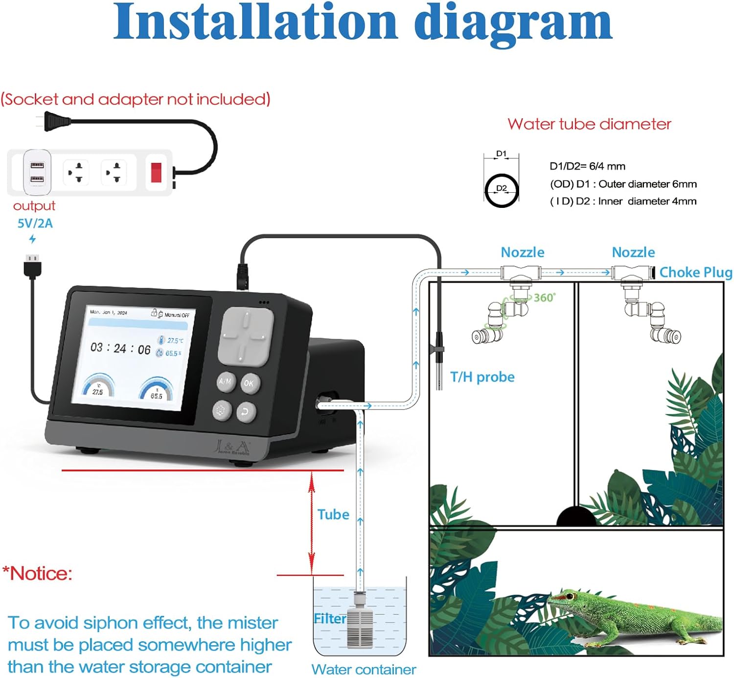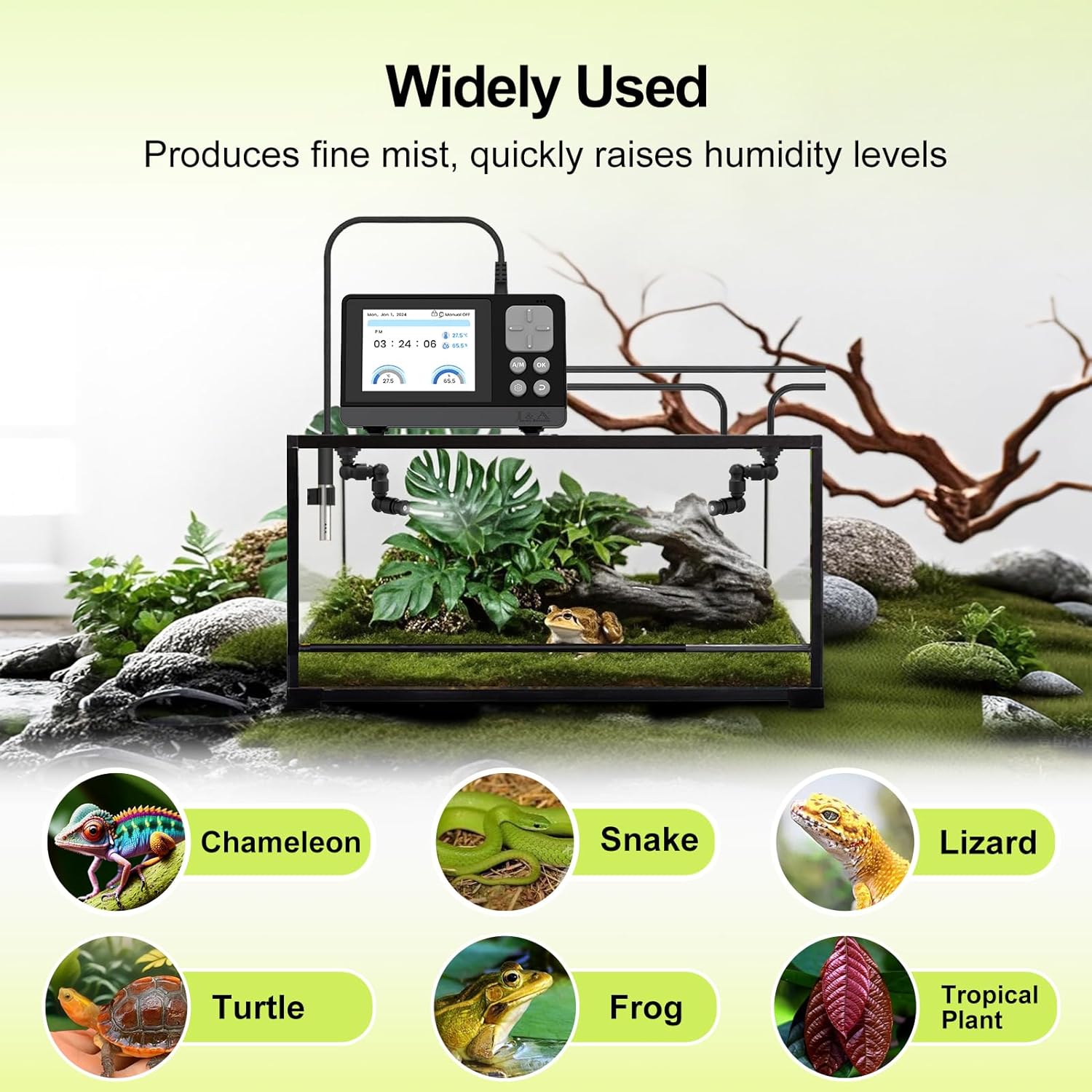 About this item Real-Time Monitoring: The automatic reptile mister program and the digital thermometer and hygrometer provide accurate control and monitoring, while the alarm prompt alerts you to any changes in environment that may affect your crawling pets. Stay informed about their environment with ease Power-off Memory: The power off memory function ensures the auto mister for reptiles starts working immediately after power is restored, never worry about losing your misting settings keeping your terrarium inhabitants thriving and healthy 360° Adjustable Nozzles: The adjustable nozzles of this reptile mister allow you to customize the misting pattern to suit the needs of your reptiles, making it the perfect for chameleons, amphibians and other terrarium dwellers. Perfect for reptile owners looking for a reliable and efficient misting solution 4 Auto Program Modes: The terrarium mister automatic offers both manual and auto work modes, giving you the flexibility to customize the misting schedule to suit your pet’s needs. 4 automatic program options allow you to set specific misting intervals, while the temperature and humidity to ensure optimal conditions for your pets What You'll Get: The terrarium misting system comes with Controller x1, T/H sensor probe x1, Sensor probe suction cup x1, Filter x1, Tube(16.4ft) x1, Nozzle x2, Choke plug x1, USB-C cable x1, User’s Manual x1 › See more product details