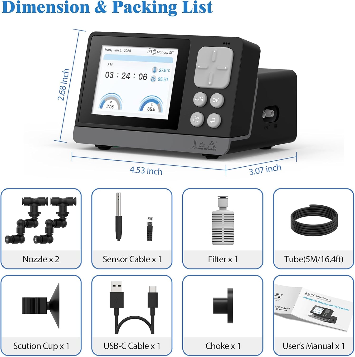 - Included Components: 360 Degree Nozzles (x2), Controller, Filter and Choke plug, Sensor Probe Suction Cup, Temperature and Humidity Sensor Probe