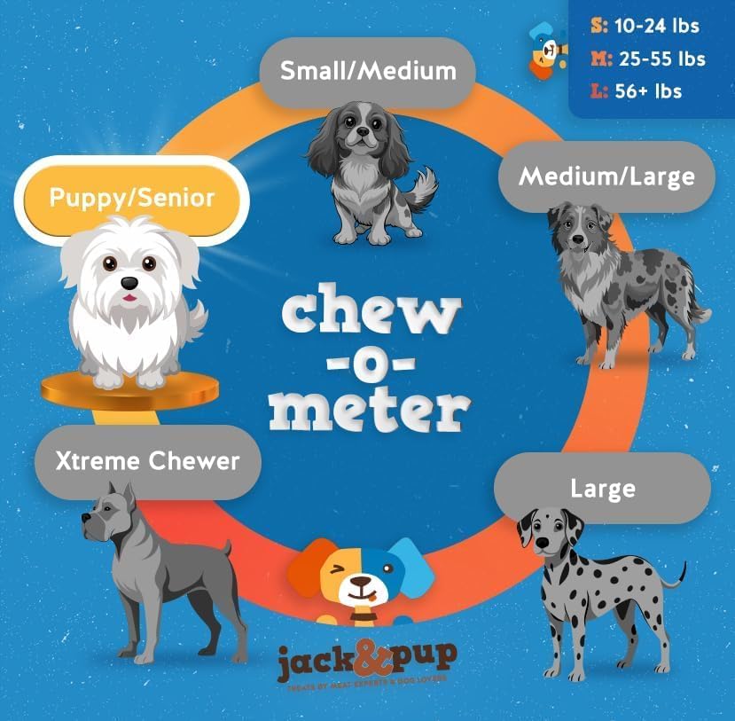 About this item Quality Treat - Jack & Pup puppy bully sticks are super thin bully sticks for dogs. Perfect bully sticks for small dogs, especially very young puppies and senior dogs. This 5 piece pack of 6" single ingredient dog chew sticks, have all the health perks of non-GMO, no preservatives plus they have a delicious beefy flavor your pup is sure to love! Pure Goodness- Honest to goodness all natural, single ingredient dog treat! No hidden ingredients, chemicals, additives or fillers in our premium baby chew sticks for dogs dog treats. No artificial flavors, preservatives or colors. Naturally high in protein, this is a treat you won't feel guilty about! Natural Flavor & Fresh – Puppy chew sticks are carefully prepared by boiling, roasting and smoking; then drying in a slow process. The multi-step process effectively locks-in the natural beef flavor resulting in an enhanced richness that dogs love. At the same time, the process keeps it fresh naturally without the use of any additives or chemicals. Stays fresh longer without any added preservatives. Supports Healthy Teeth & Gums – By ensuring its’ consistently perfect texture and thickness, Jack&Pup junior bully sticks helps keep the dog’s teeth healthy and clean. Effectively removes tartar build-up, strengthens the gums, removes plaque and promotes an overall enhanced oral health. The Jack&Pup Family Guarantee - At Jack & Pup we consider you family, and you have our family guarantee that you will be satisfied! If you love us, give us a shout out, and if there are any concerns with the treats you received, please reach out to our always ready to help costumer service team so we can make it right! › See more product details