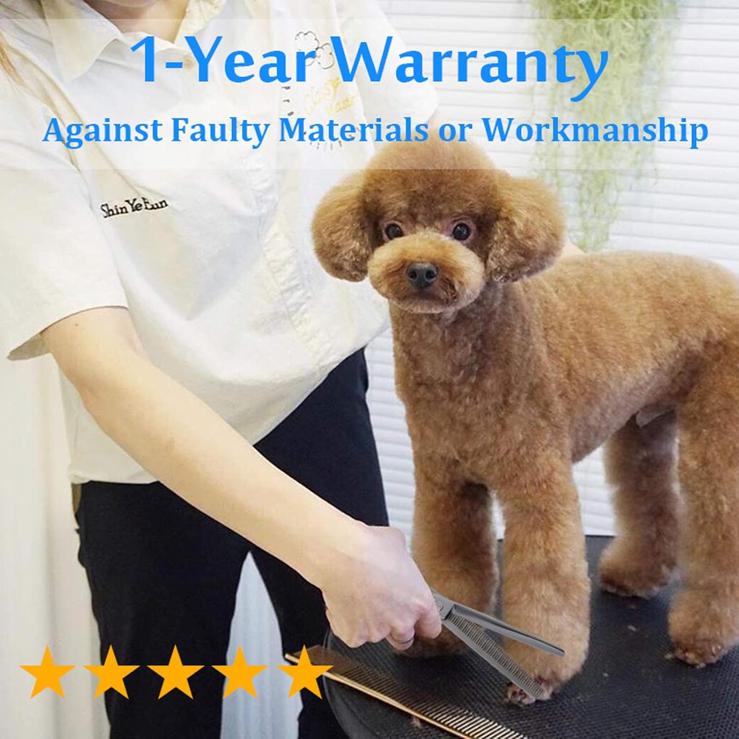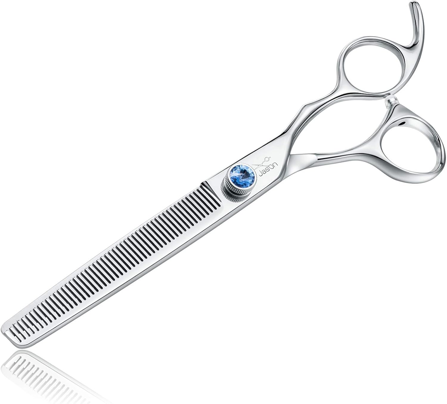 About this item This 7" thinning shears for dogs is great for bulk thinning, and has 50 teeth, which gives a wonderfully fine finish. It is especially good for work around the face and for blending through differing lengths for a seamless finish. It's a very suitable gift. One blade of this scissor is exceptionally smooth, for clean, snag-free grooming and a wonderful coat finish, while the other features 50 notched teeth to texturise and blend the coat. Under normal circumstances, the blades can open and close smoothly. But it is possible that some scissors were damaged during transit, resulting in the blades being unable to close properly. This exceptional quality dog thinning shears is made from specially hardened Japanese 440C steel, and have a superbly sharp convex edge for the superior cutting action. The blades of this scissor are exceptionally smooth, for clean, snag-free grooming. But excessive blade separation can lead to irreparable jamming. This 7-inch blending shears features ergonomically shaped offset handles and slightly bent down thumb for a comfortable scissor grip, optimum control and therefore greater accuracy, while the permanent finger rest offers extra control and a greater level of balance. Precision blue crystal dial adjustable click tension system ensures quiet, smooth and effortless scissoring Hand-forged by skilled crafts men, these dog trimming scissors offer good value for money, making them ideal for commercial work in busy grooming salons. These dog grooming scissors are light-weight and easy to control.It is great for general everyday dog grooming tasks. The shear is perfect for the beginner or home groomer, as well as the seasoned professional › See more product details