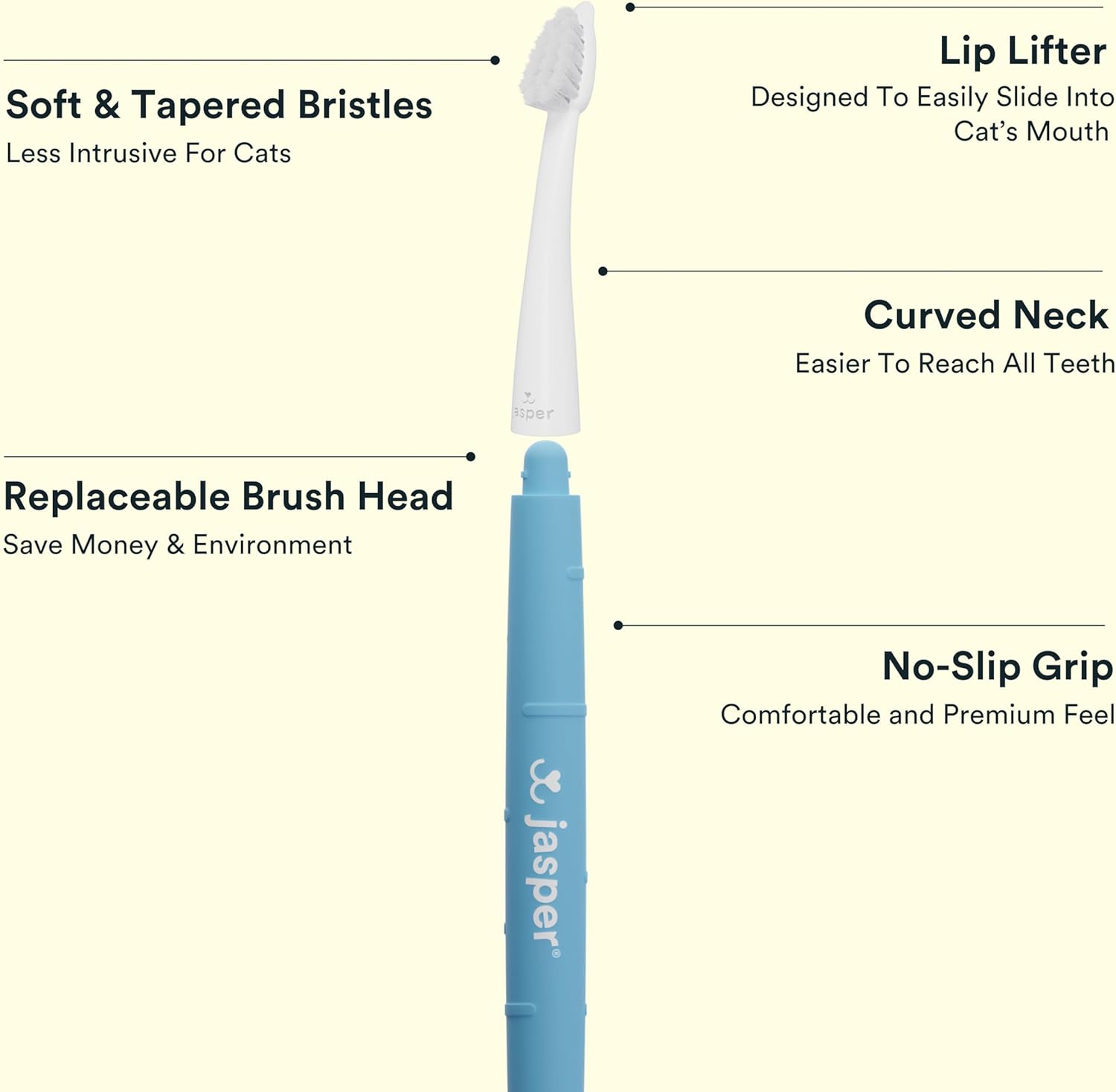 About this item DESIGNED FOR CATS AND SMALL DOGS - Our cat and puppy toothbrush is specially designed for cats and small pets. It features an extra narrow head and tapered bristles that align with smaller teeth, and a novel “lip lifter” that helps you insert the brush when cats are reluctant to open wide. The unique design facilitates effortless cat teeth cleaning. EXTRA GENTLE BRISTLES - Our cat and small dog toothbrush utilizes extra soft DuPont nylon bristles for a more gentle cat teeth cleaning session. for minimize feline discomfort during brushing sessions. ERGONOMIC DESIGN - Featuring a soft grip handle and curved neck, our pet toothbrush effortlessly reaches your furry friend’s side and back teeth. Perfect for cats, puppies, and small breeds like Yorkies. ENHANCED GRIP - Our cat toothbrush features a soft grip handle for a secure hold, which is especially helpful with restless animals. SUSTAINABLE REPLACEMENT HEADS - Keep the handle and simply replace the heads to reduce waste and save money - cat care that’s environment and cost friendly! We recommend replacing heads every 3-6 months. DESIGNED WITH VETERINARY DENTIST - Our cat and small dog toothbrush has been meticulously developed in partnership with a veterinary dentist. This collaboration underscores our unwavering commitment to quality and safety, ensuring that your pet receives the best dental care possible. › See more product details