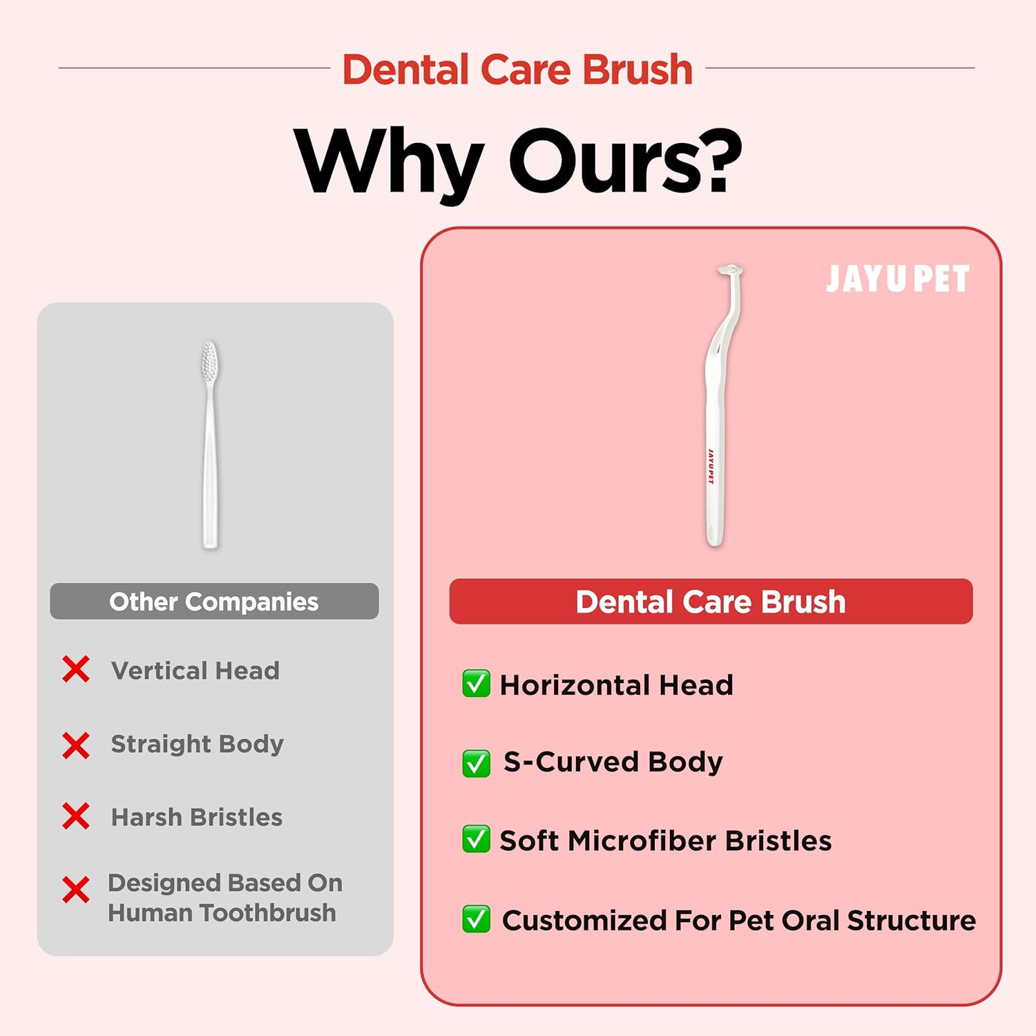 About this item Extra Soft Bristles (0.08mm microfiber) - The soft PBT material bristles are suitable for cat, kitten and puppy who are new to brushing their teeth or are afraid to brush their teeth. Perfect Tartar Removal - Our ergonomic fit horizontal toothbrush is suitable for sharp & curved teeth and weaker gum. More effective using with JAYU PET Dental Gel. Fun Toothbrushing Time - The toothbrush is customized dog toothbrush & cat toothbrush (horizontal head and S-curved body) based on the pet’s oral structure. Therefore, pets tend to feel more comfortable while brushing their teeth. Easy 3D Grip & Ergonomic Design - Customized tooth brush head and body(handle) based on pet oral structure & Non breakable. Our ergonomic fit horizontal toothbrush is suitable for dog and cat with sharp and curved teeth. It can clean all tooth with horizontal bristles toothbrush. Experts Developed - Veterinarian, Doctor, and Oriental Doctor researched and developed the BEST curve & angle to effectively remove tartar deep inside of teeth. Satisfaction Guaranteed - Our pet toothbrush is frequently recommended by vets because of it’s high quality design and effect, and we're so confident that you'll love this cat oral care kit. If you have any question, feel free to contact us. › See more product details