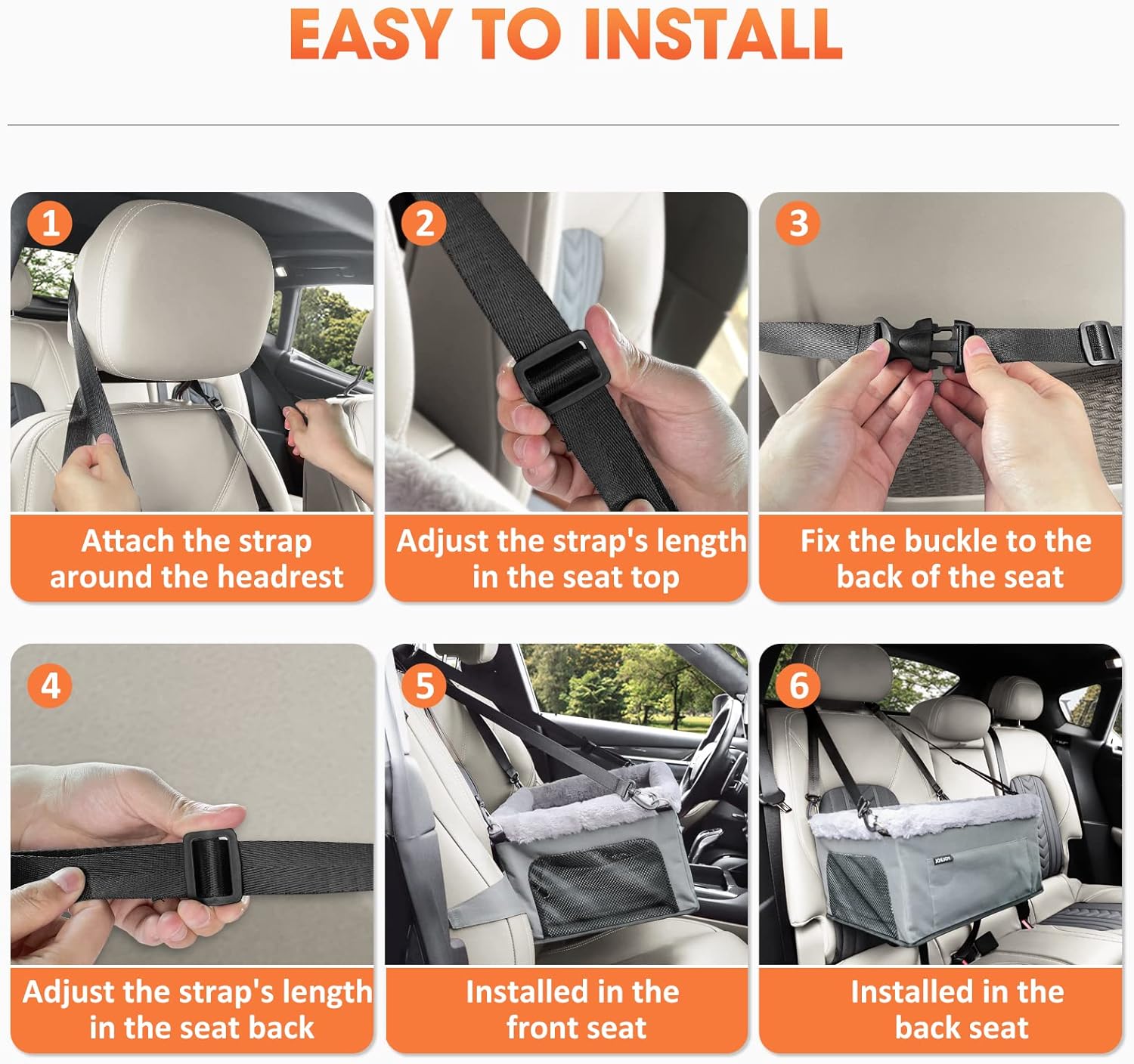 About this item 🐶: Our unique dog car booster seat is designed to give your furry friend the perfect height to look out the car window, your furry friend will enjoy the journey with you, reducing car sickness. 🐶: The internal collapsible metal frame provides sturdy support for your pet, while the two adjustable seat belts ensure the booster seat stays securely in place and prevents it from sliding around in the car. Additionally, the clip-on safety leash keeps your dog securely fastened in the car seats, providing extra safety and peace of mind. 🐶: The dog booster car seat is crafted from durable Oxford cloth that’s water-resistant, and durable. The plush rim is filled with soft material for your furry friend to rest their paws. With an air-circulating mesh design, the seat promotes smooth breathing, ensuring a comfortable ride. Additionally, The thick cushion provides a cozy ride, making it perfect for your pet's travel needs. 🐶: With its adjustable buckle design, the car seat for dogs can be easily installed. Simply attach the two straps around the headrest, fix the buckle to the back of the seat, and adjust the strap length as needed. It can be installed in both the front and back seats of your car, and it is compatible with most types of car seats and car models. 🐶: Measuring 16 X 13 X 9 inches, this puppy car seat is designed for small dogs or cats weighing up to 20 lbs, such as Chihuahuas, Yorkshire Terriers, Havanese, and Shih Tzus. To ensure the perfect fit for your furry friend, please measure your dog before making your purchase. › See more product details